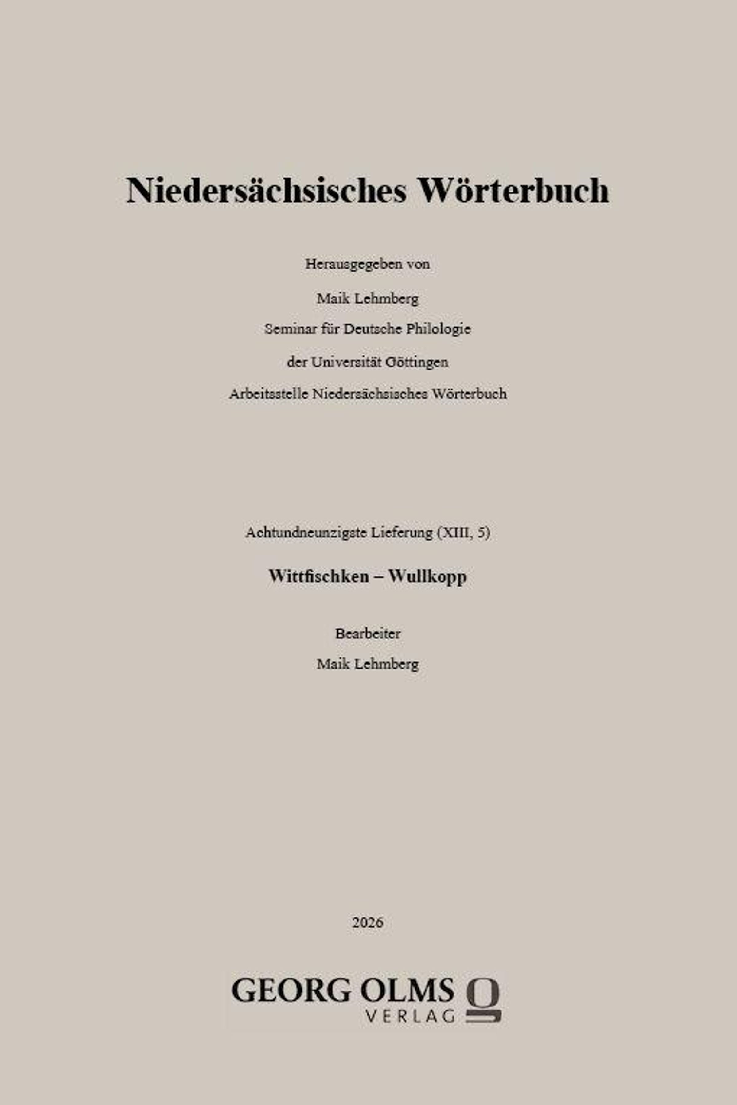 "Niedersächsisches Wörterbuch, Georg Olms Verlag, Entwurf von Maik Lehmberg, Ausgabe 2026."
