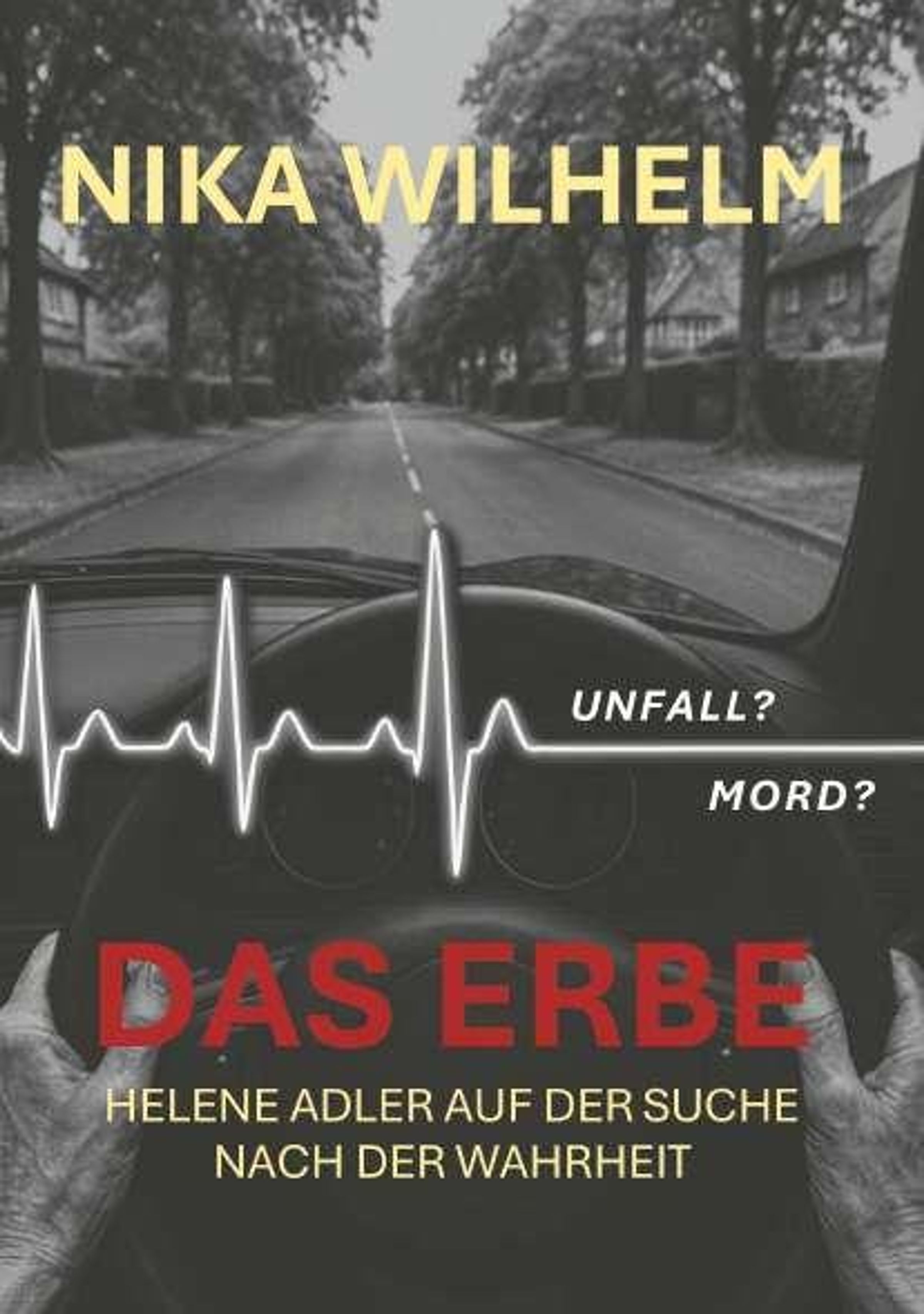 NIKA WILHELM, DAS ERBE, Helene Adler sucht die Wahrheit, Unfall? Mord?, EKG-Linie, Blick aus einem Auto auf eine Straße., Buch
