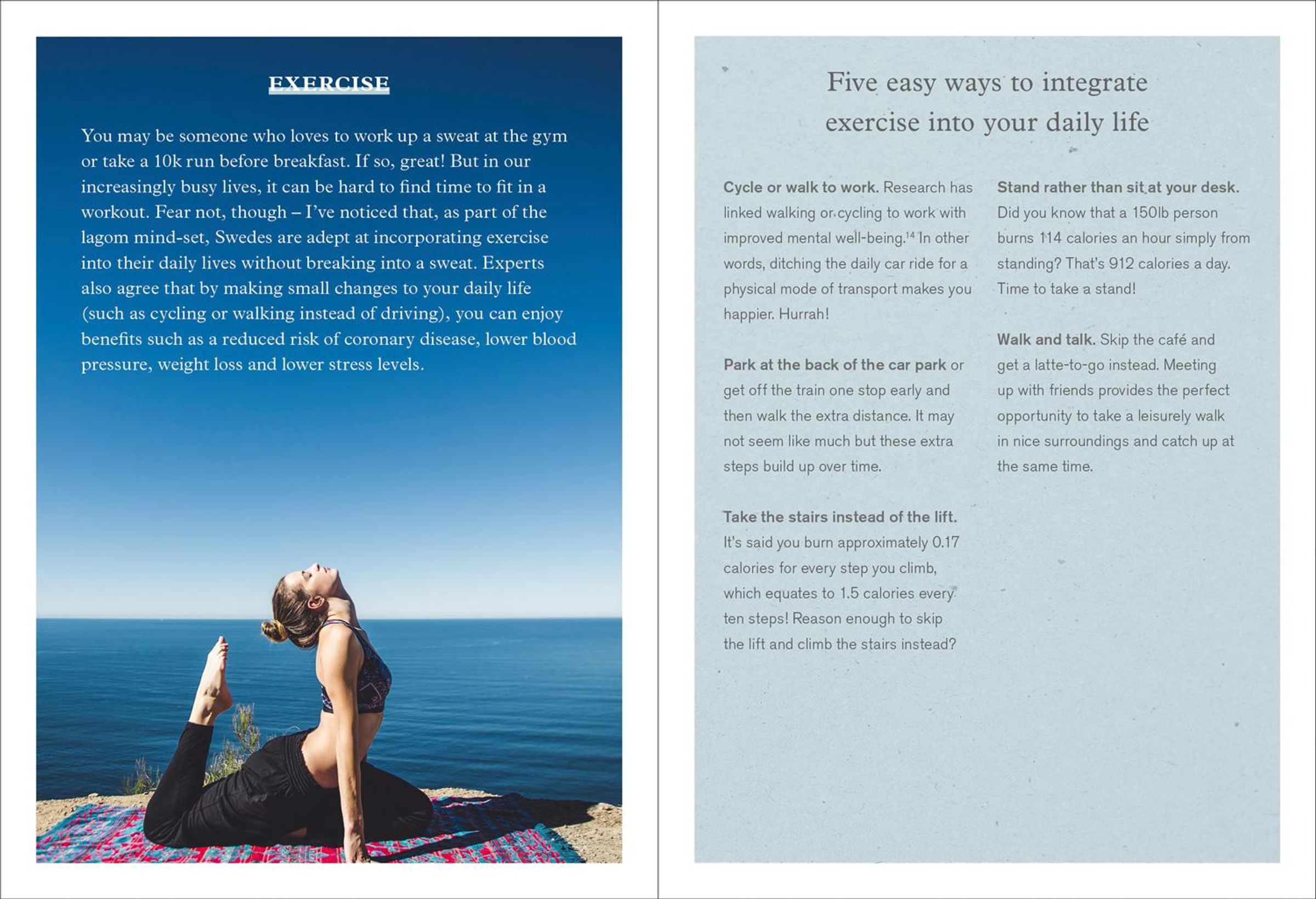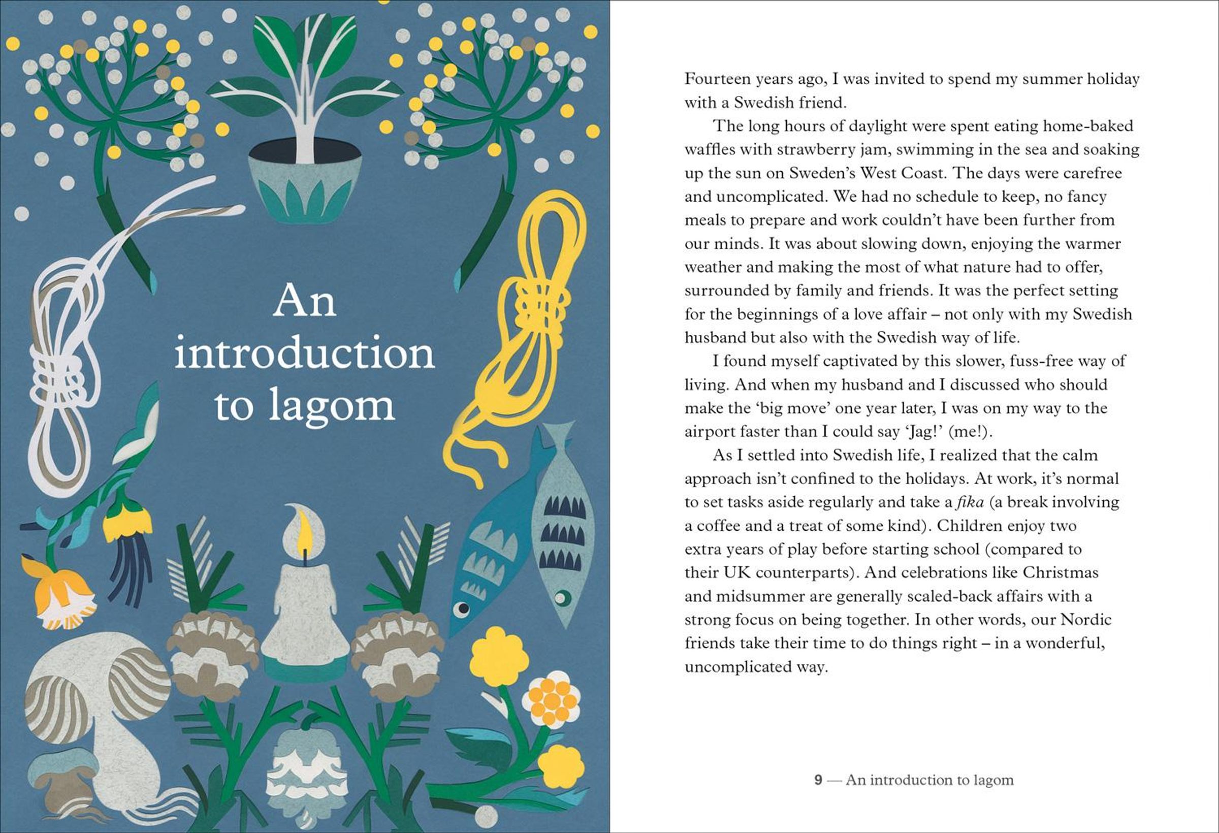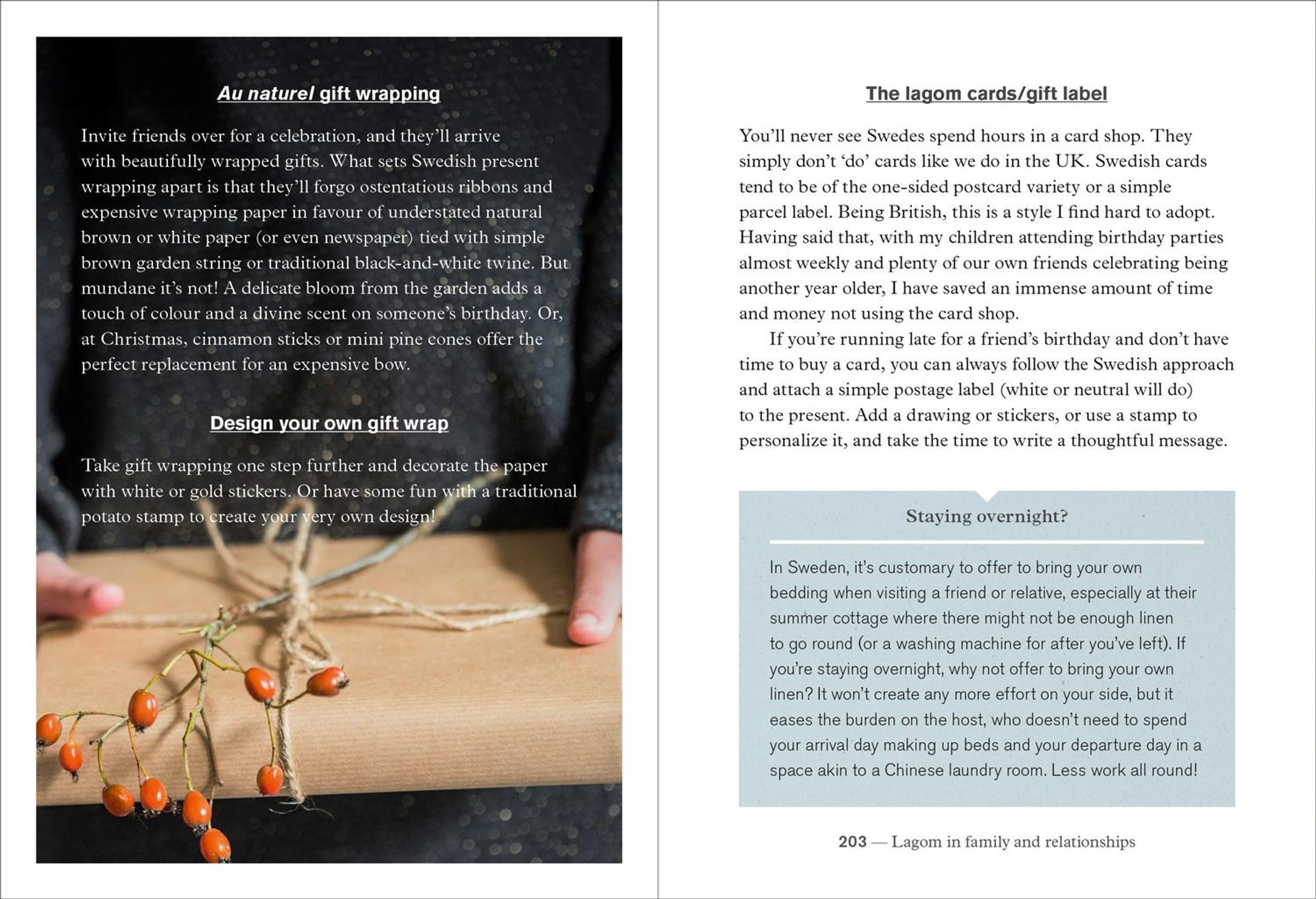 The book is divided into three sections. Introducing Lagom to your personal life includes ideas for decluttering your home, conscious buying and embracing 'slow design'. At work take time to balance your day with a proper lunchbreak and a gadget free Sabbath, while outdoor staycations in remote settings can offer relaxation you never knew possible!