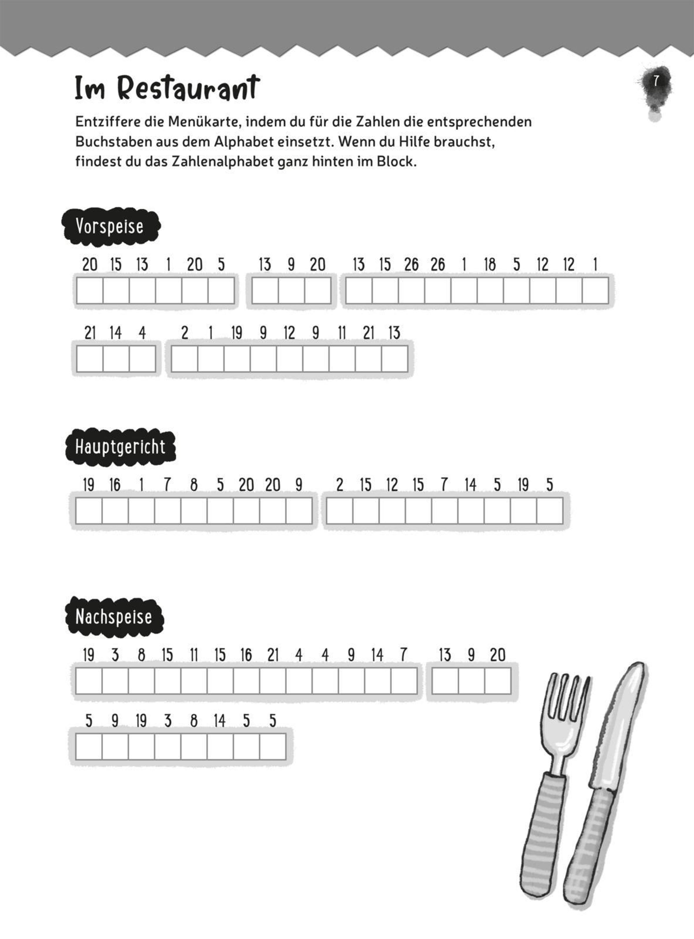 Kreuzworträtsel ¿ Zahlenpyramiden ¿ Wortschlangen ¿ Zahlenpyramiden ¿ Bilderrätsel ¿ Sudoku ¿ Labyrinthe ¿ Schattenbilder ¿ Rechenrätsel ¿ Kritzeleien und Eintragseiten.