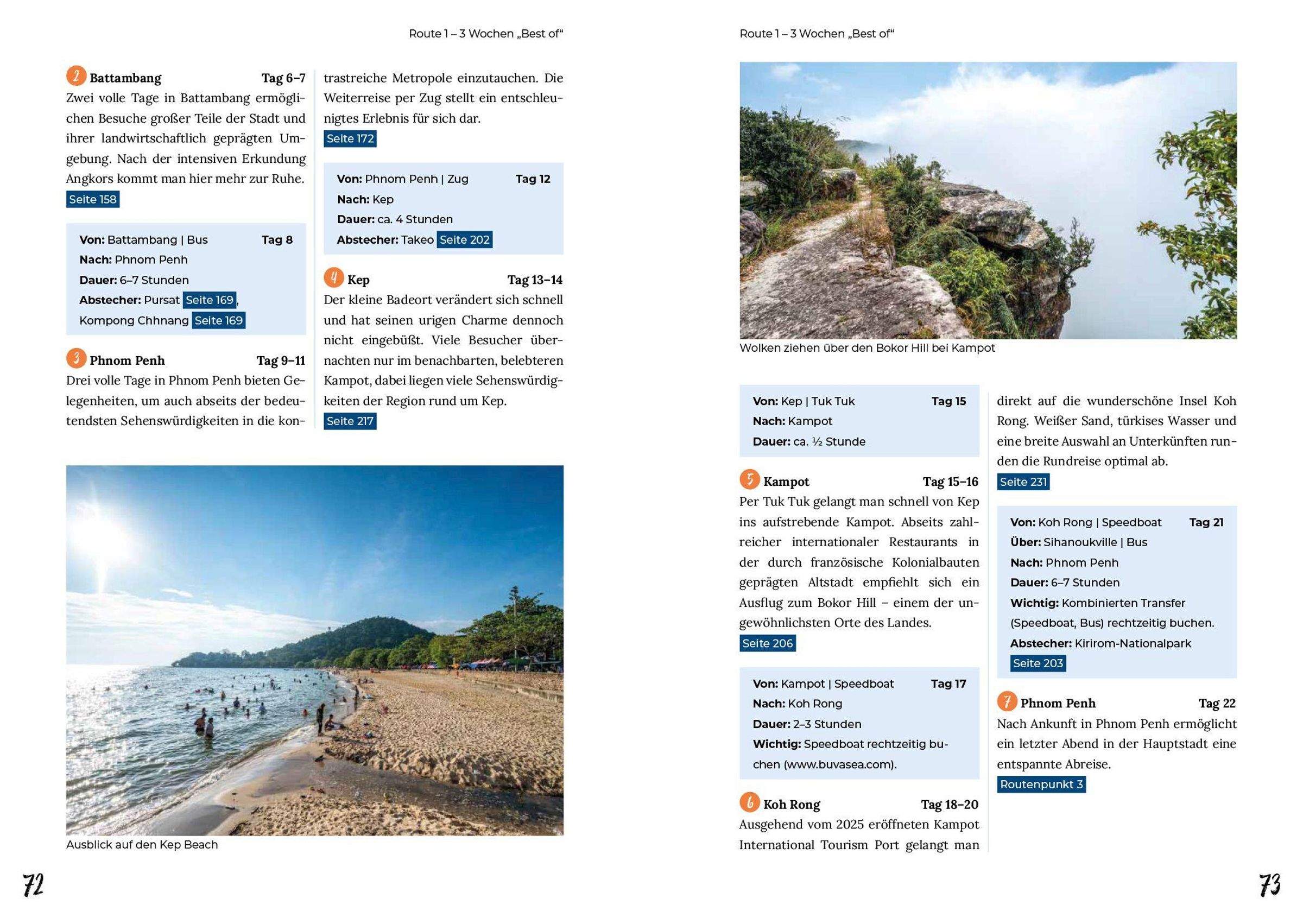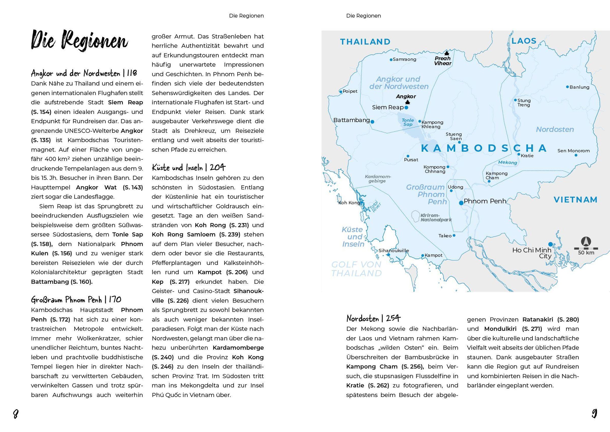 Übersichtsseiten mit Beschreibungen aller Regionen: Angkor und der Nordwesten, Großraum Phnom Penh, Küste und Inseln und Nordosten