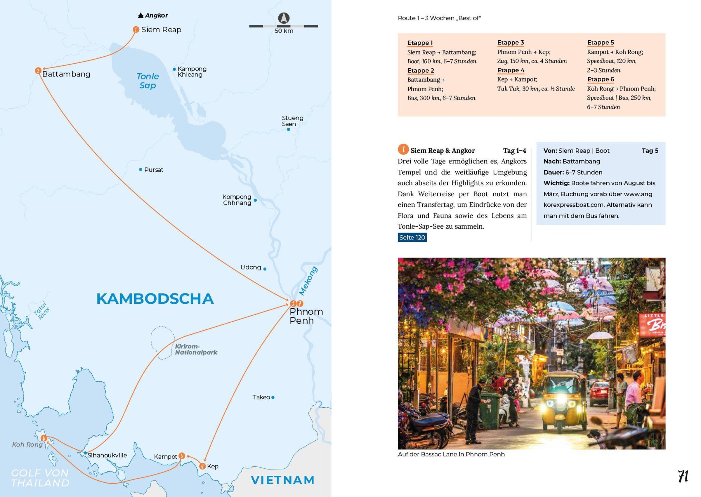 Geheimnisvolle Tempelruinen, strahlend weiße Strände und herzensgute Menschen machen das Königreich Kambodscha zu einem kontrastreichen Reiseziel, das deutlich mehr zu bieten hat, als viele erwarten. Beim bewegenden Anblick Angkor Wats, während der Erkundung der Mahnmale der Schreckensherrschaft der Roten Khmer, auf den traumhaft schönen Inseln und in der Metropole Phnom Penh wird immer mehr Reisenden klar, dass Kambodscha zu Unrecht im Schatten seiner großen Nachbarn Thailand und Vietnam steht. Trotz weiterhin vielerorts sichtbarer Armut ist dem kleinen Land der Aufbruch in die Zukunft längst gelungen. Dieser Reiseroutenführer ermöglicht es, Reiseziele entlang und abseits der Touristenpfade intensiv und individuell zu erkunden.