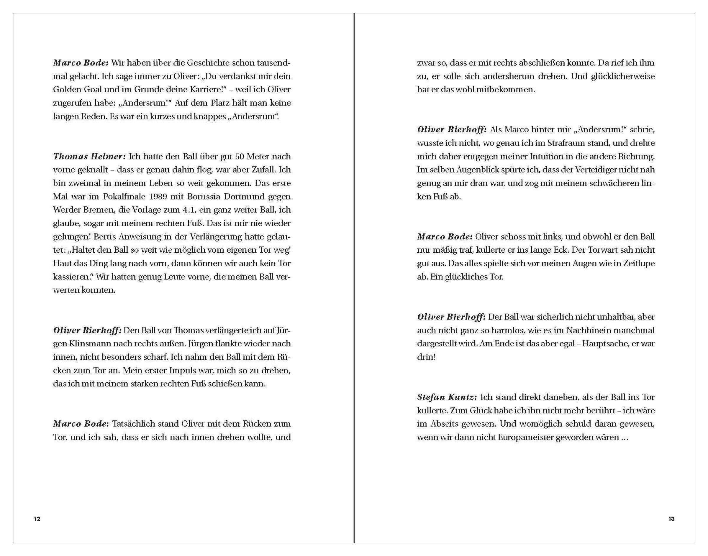 Die Europameisterschaft 1996 in England war in vielerlei Hinsicht ein außergewöhnliches Turnier. Es fiel mitten in die Hochzeit des "Britpop", die Fans schwelgten zu den Klängen von "Don¿t Look Back in Anger" von Oasis, der Ball rollte in "reinen" Fußballstadien, in denen man dem Geschehen ganz nah war (nach dem Turnier wurden sie auch in Deutschland eingeführt). Und dann gewann eine groß aufspielende deutsche Elf mit Bundestrainer "Bördie Vogts" auch noch den Titel, mit dem ersten "Golden Goal" der Fußballgeschichte, und das ausgerechnet im Stadion von Wembley, wo man in einem Herzschlaghalbfinale zuvor die Gastgeber nach Elfmeterschießen aus dem Turnier geworfen hatte!