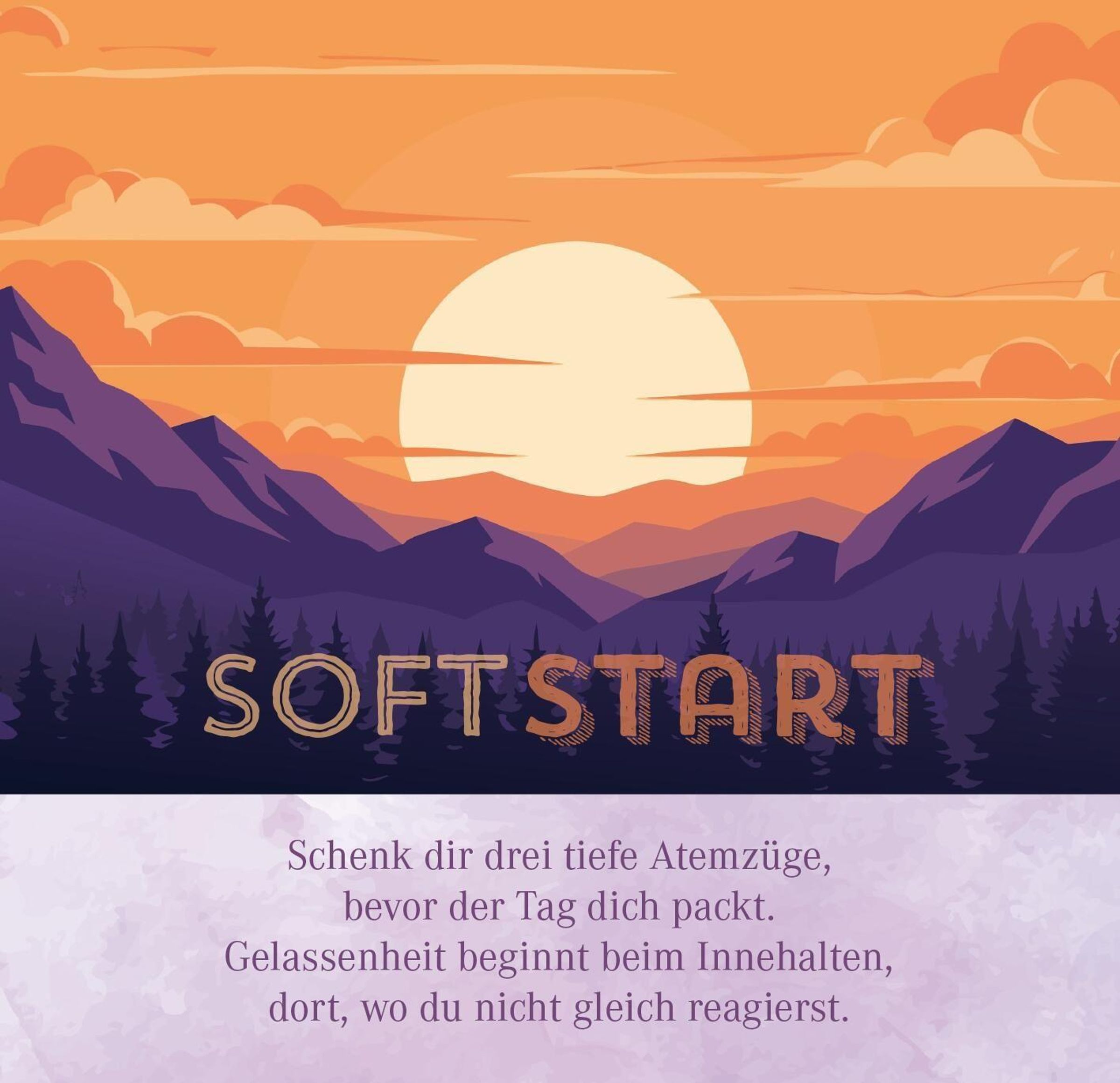 Mit diesem liebevoll gestalteten Aufsteller schaffst du kleine Ruheinseln in deinen Alltag. Inspirierende Impulse, achtsame Übungen und wohltuende Zitate laden dazu ein, langsamer zu werden, den Moment bewusst wahrzunehmen und gelassener auf das Leben zu reagieren - Tag für Tag, auch wenn es draußen turbulent ist.