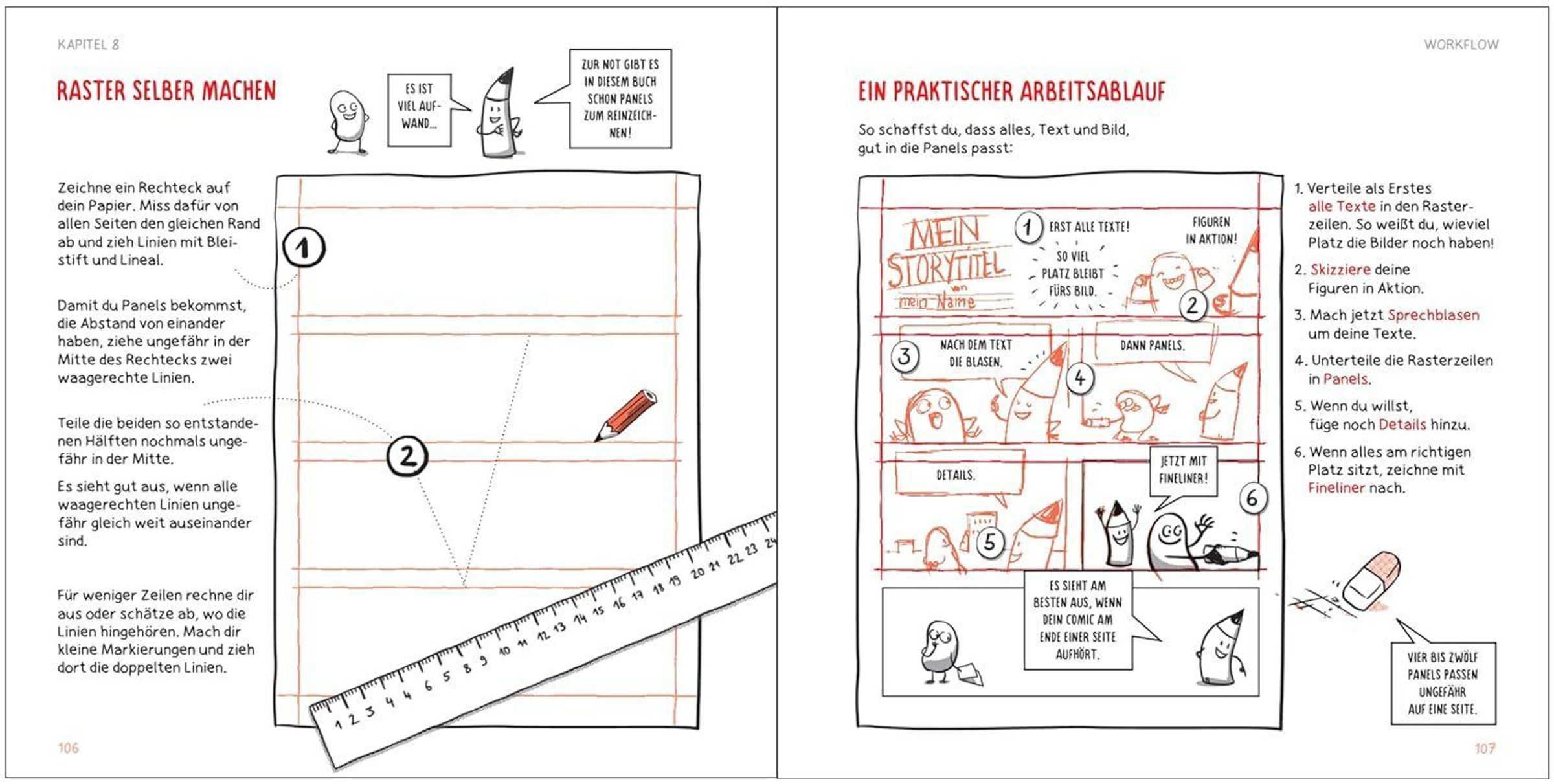 Viele praktische Tipps und hilfreiche Anregungen helfen dir beim Umsetzen deiner Ideen. Zusätzlich findest du viele Seiten zum Üben und Platz für eigene Comics.