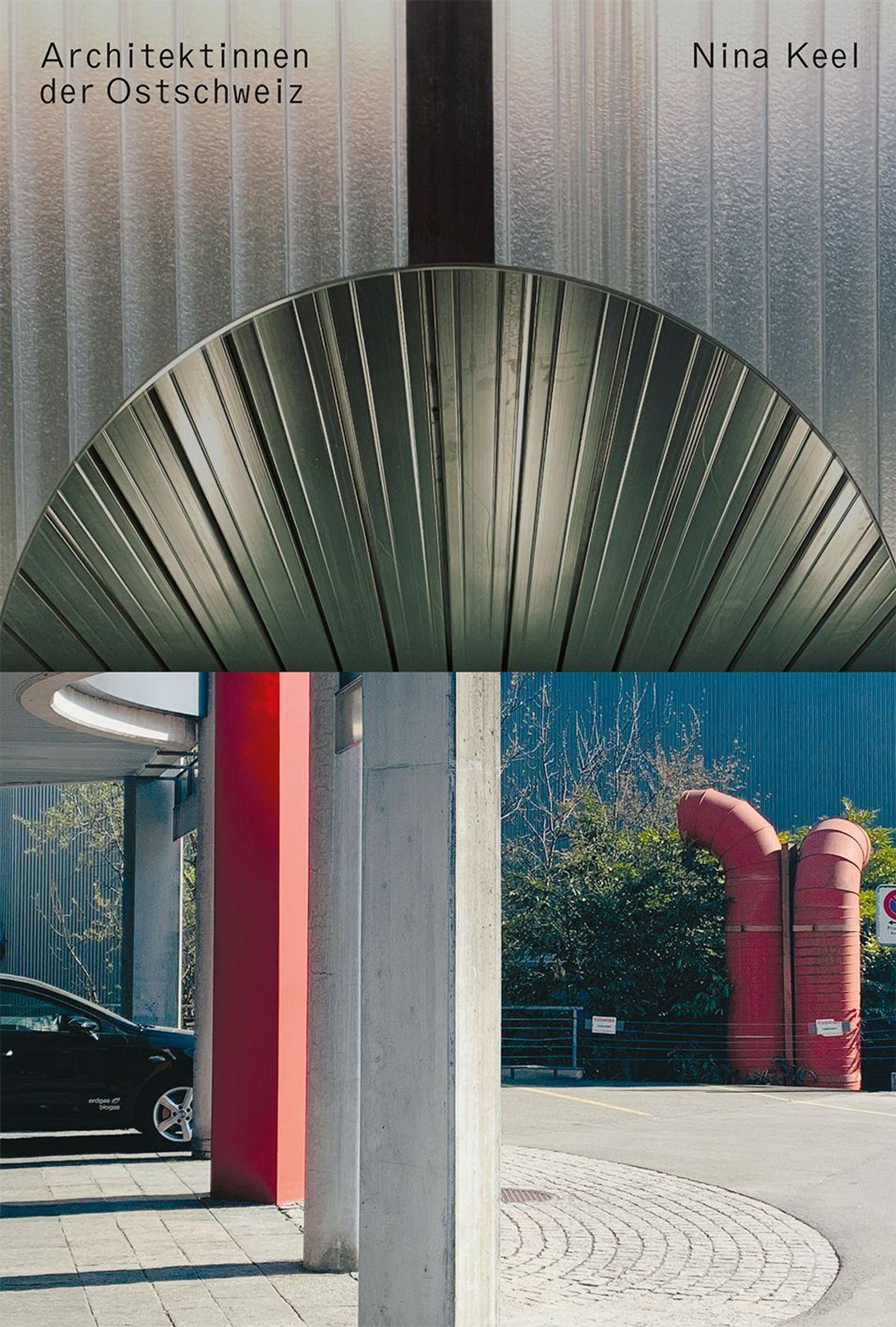 "Architektinnen der Ostschweiz" und "Nina Keel". Oben eine moderne Struktur, unten rote Rohre und Architekturdetails., Buch