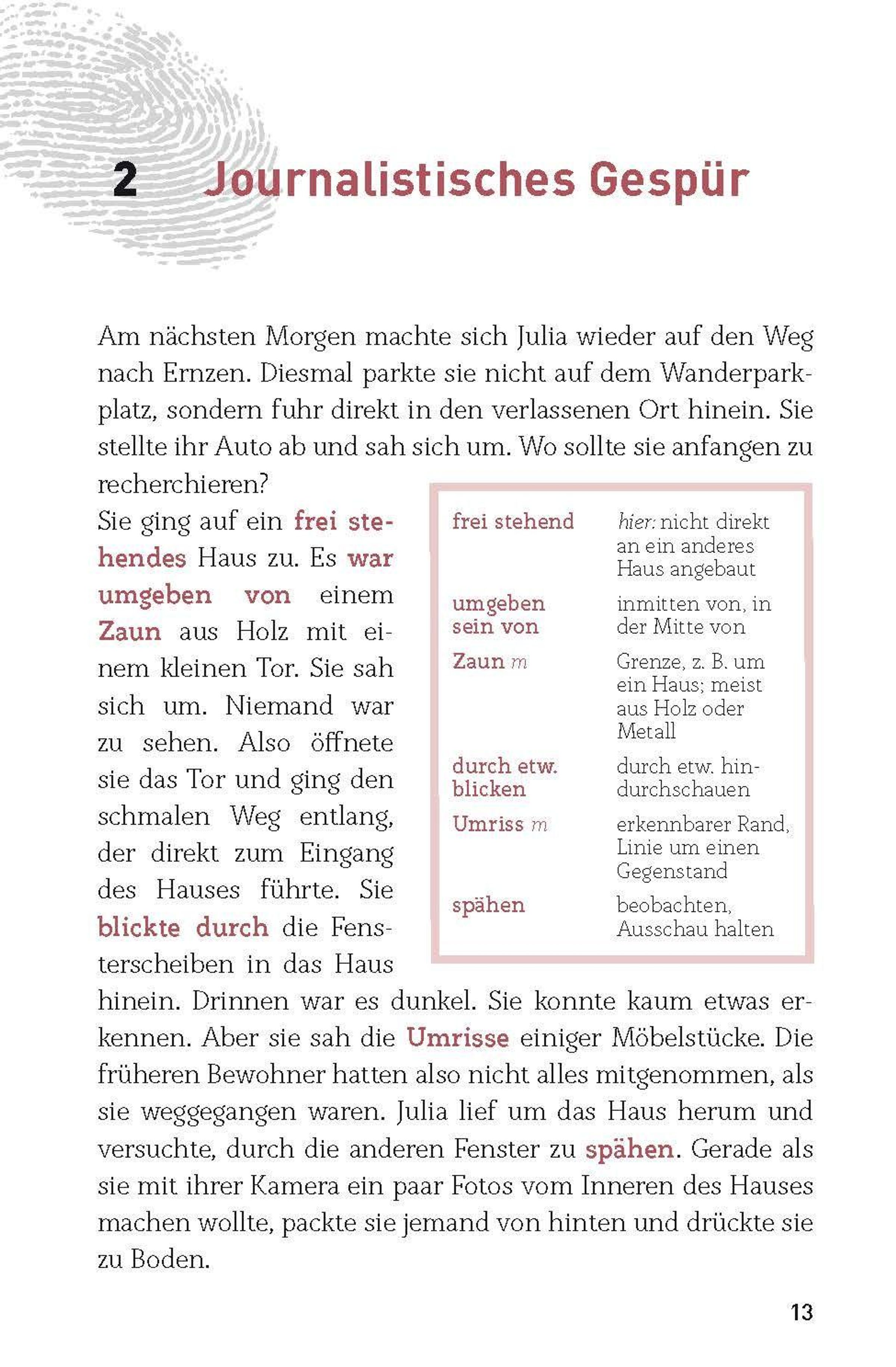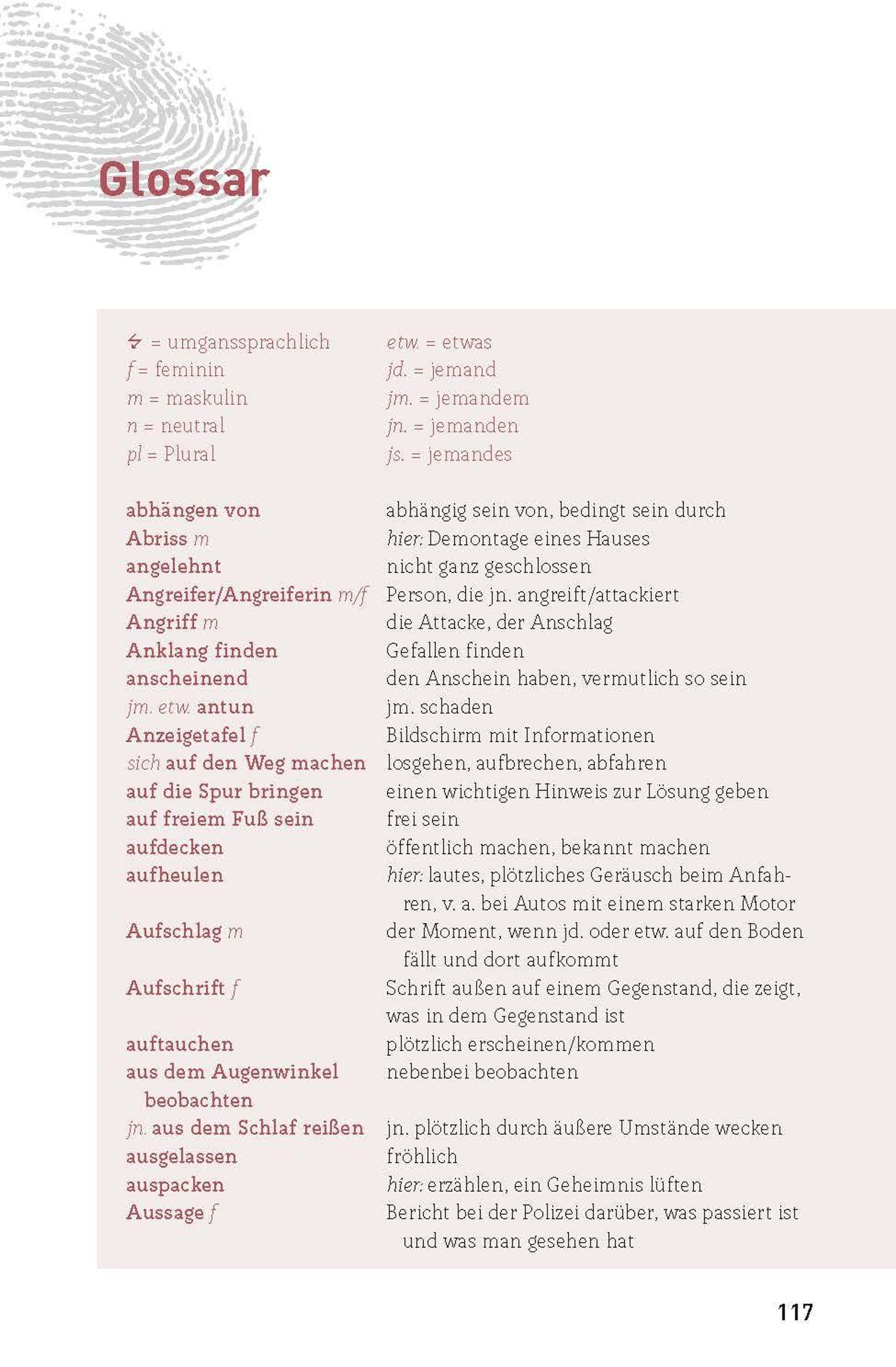 - Infokästen zu Sprache und Grammatik: Zusätzliche Informationen, Tipps und Wissenswertes zu Sprache, Grammatik und Landeskunde runden den Lernkrimi Kurzkrimi "Der Blutfleck" ab.
