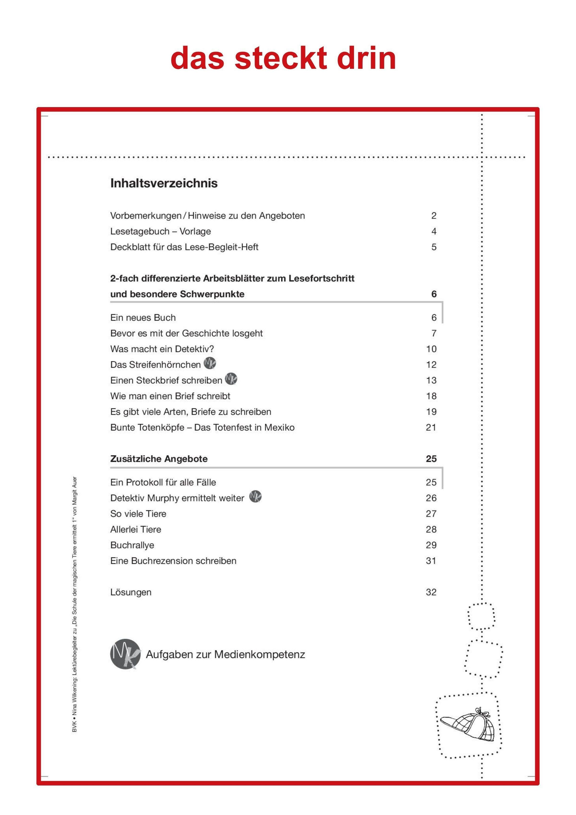 Der Lektürebegleiter zu Margit Auers Kinderkrimi "Die Schule der magischen Tiere ermittelt 1: Der grüne Glibber-Brief" enthält zweifach differenzierte Arbeitsblätter, die den Lesefortschritt der Kinder begleiten. Dabei werden die Themen des Buches aufgegriffen und zum Teil auf zusätzlichen Arbeitsblättern vertieft. Zu diesen Themen gehören Briefe schreiben, Detektive und Freundschaft. Auch der Medienkompetenzrahmen wird in verschiedenen Aufgaben eingebunden.