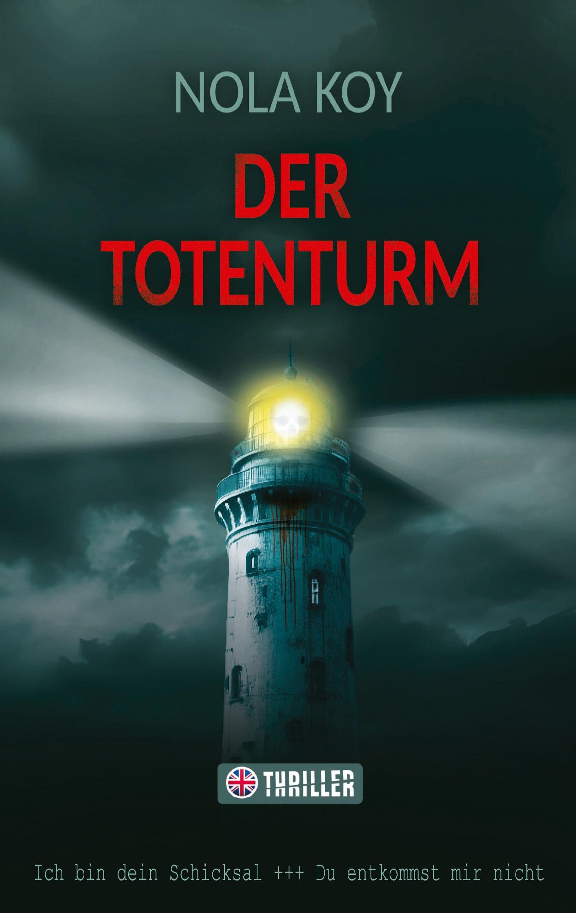 "NOLA KOY DER TOTENTURM. Ich bin dein Schicksal +++ Du entkommst mir nicht." Illustration mit einem Leuchtturm und Totenkopf., Buch