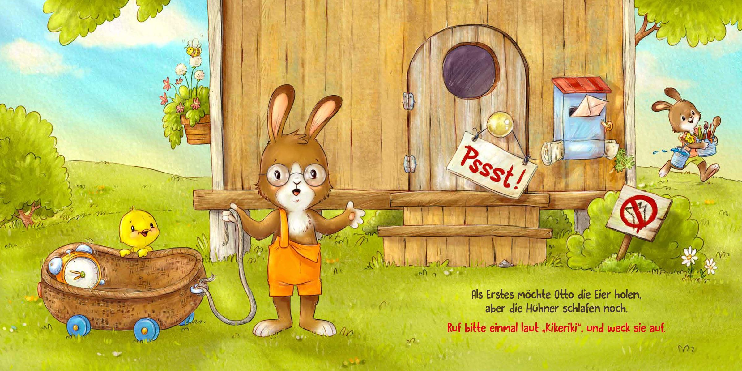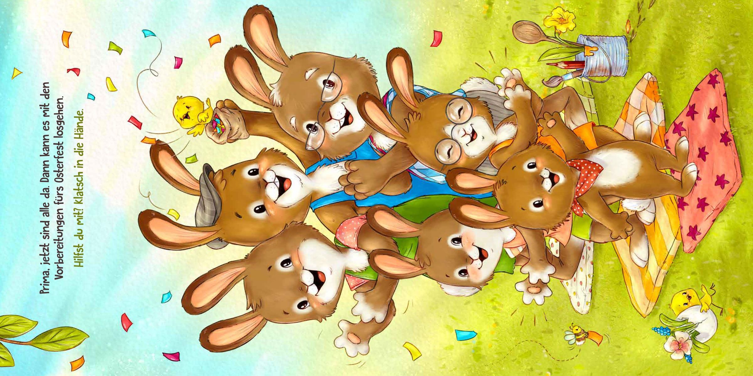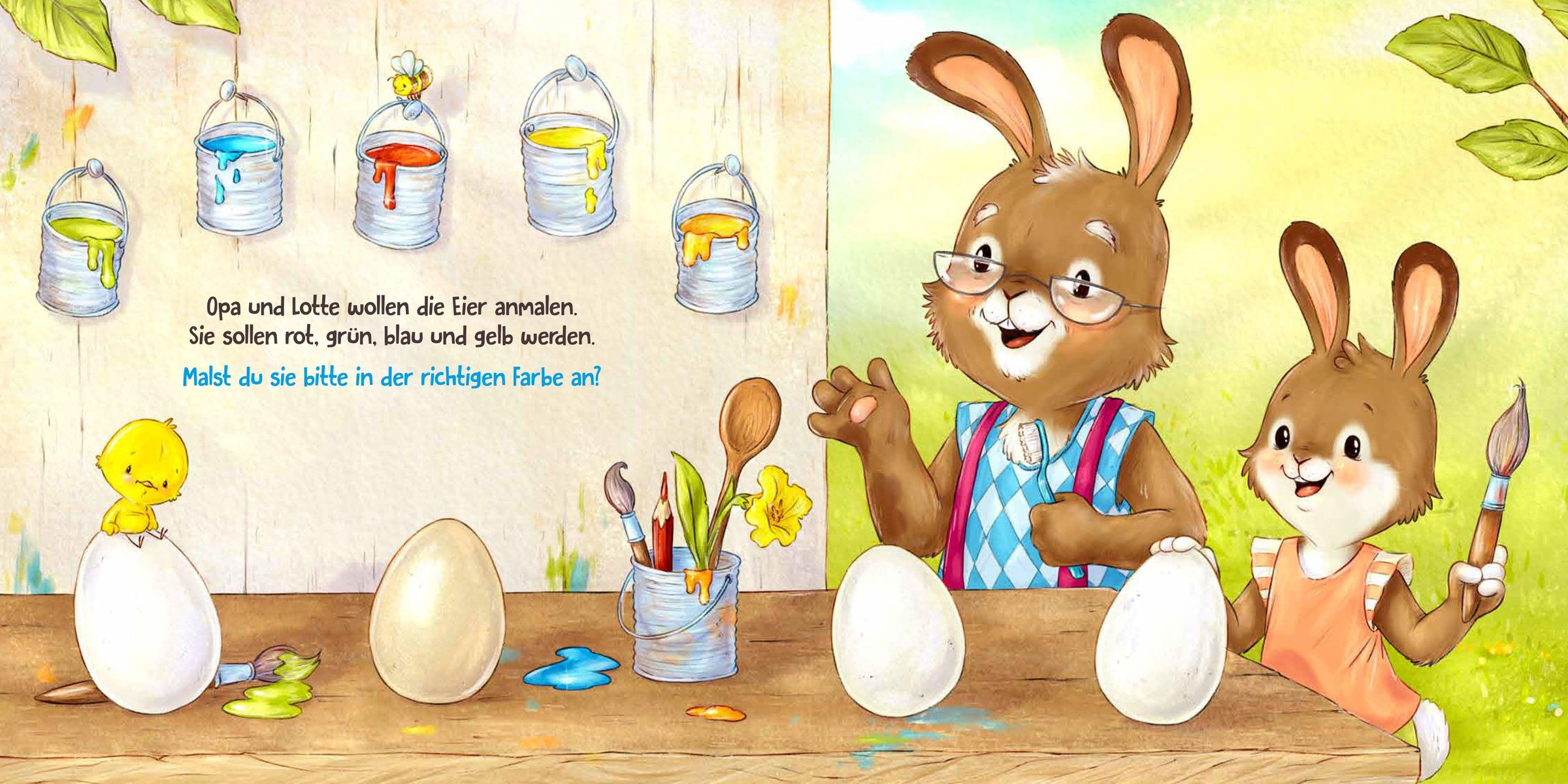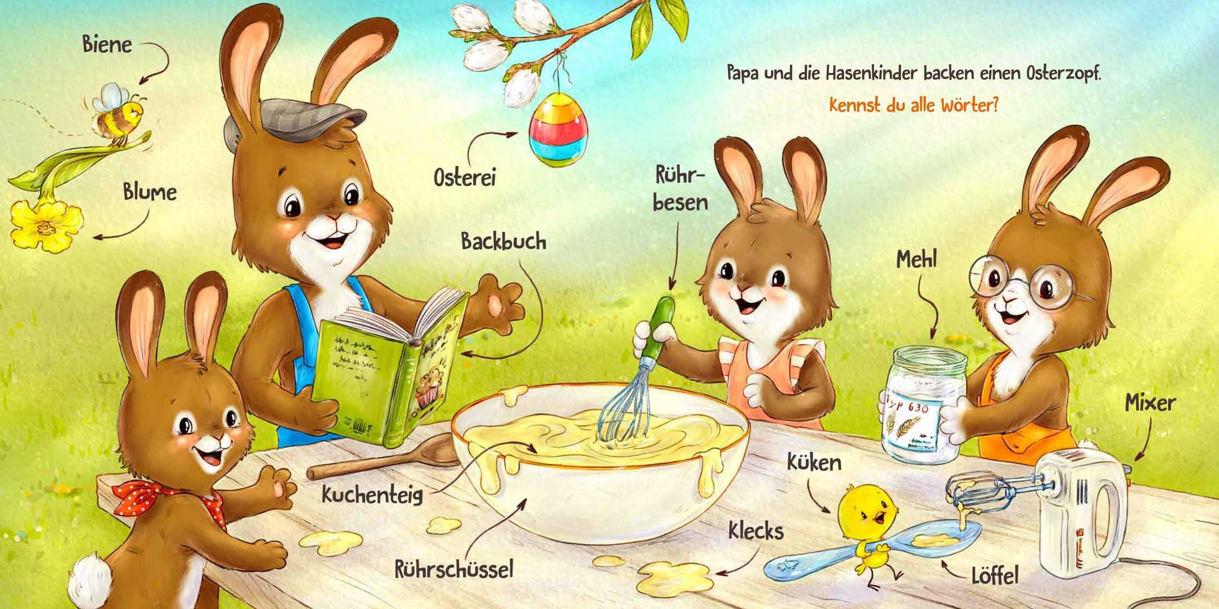 Familie Osterhase kann es kaum erwarten: Das große Osterfest steht bevor! Und es gibt noch allerhand zu tun. Damit alles rechtzeitig fertig wird, packt die ganze Familie mit an: Mama und Papa, Opa Hase, Lotti und Otto - doch wo ist das kleinste Hasenkind Timmi nur hin? Ach, da ist er ja! Dann kann es endlich losgehen, und auch die kleinen Leser: innen müssen mithelfen: Mit Otto die Hühner wecken und mit Opa und Lotte die Eier bunt anmalen. Einmal kräftig pusten nicht vergessen! Doch huch! Während der Osterzopf im Ofen duftet, sind plötzlich alle Eier verschwunden. Wer findet sie wieder? Was für ein lustiges Osterfest!