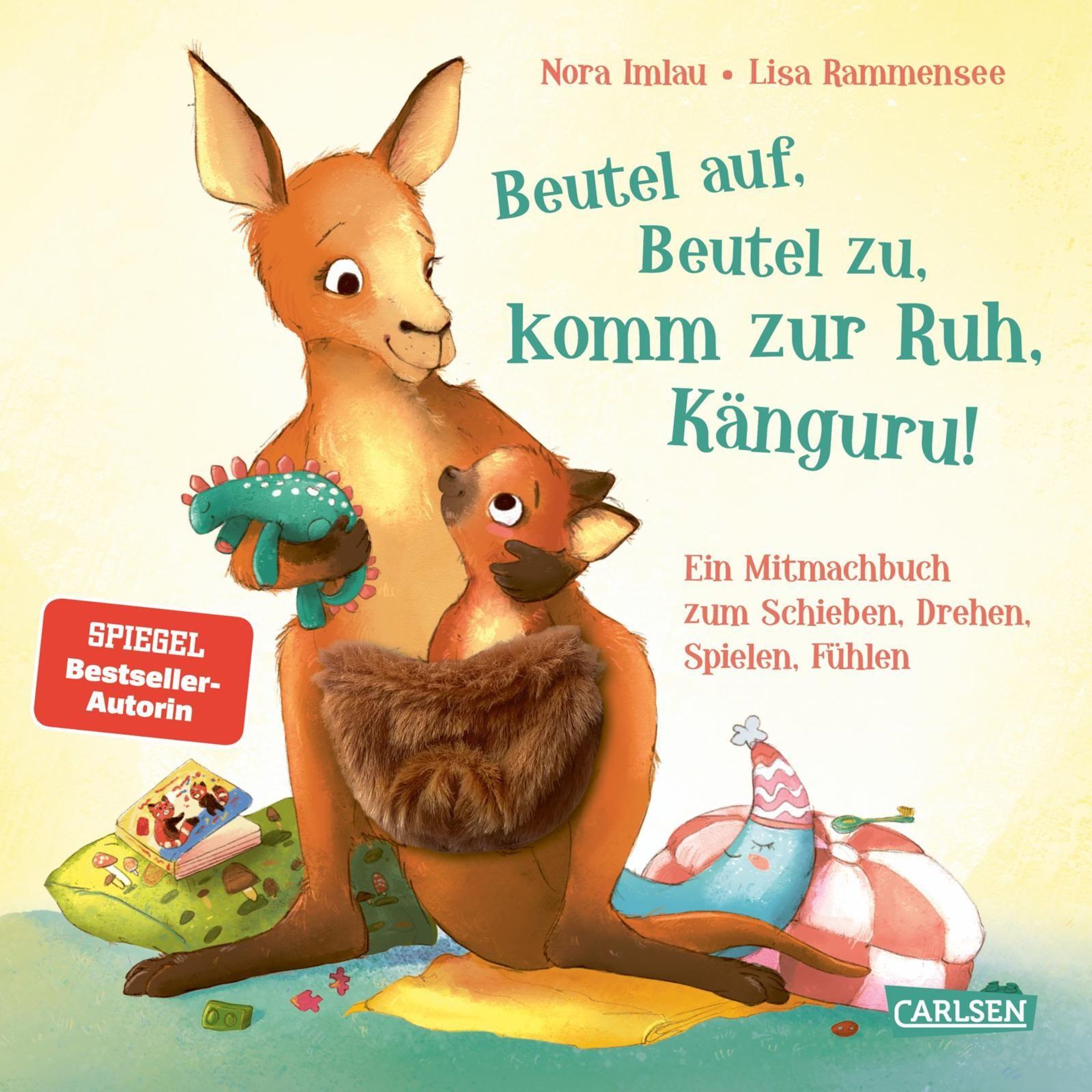 - Mit Schiebern und Drehscheibe innen und kuscheligem Stoff-Kängurubeutel auf dem Cover