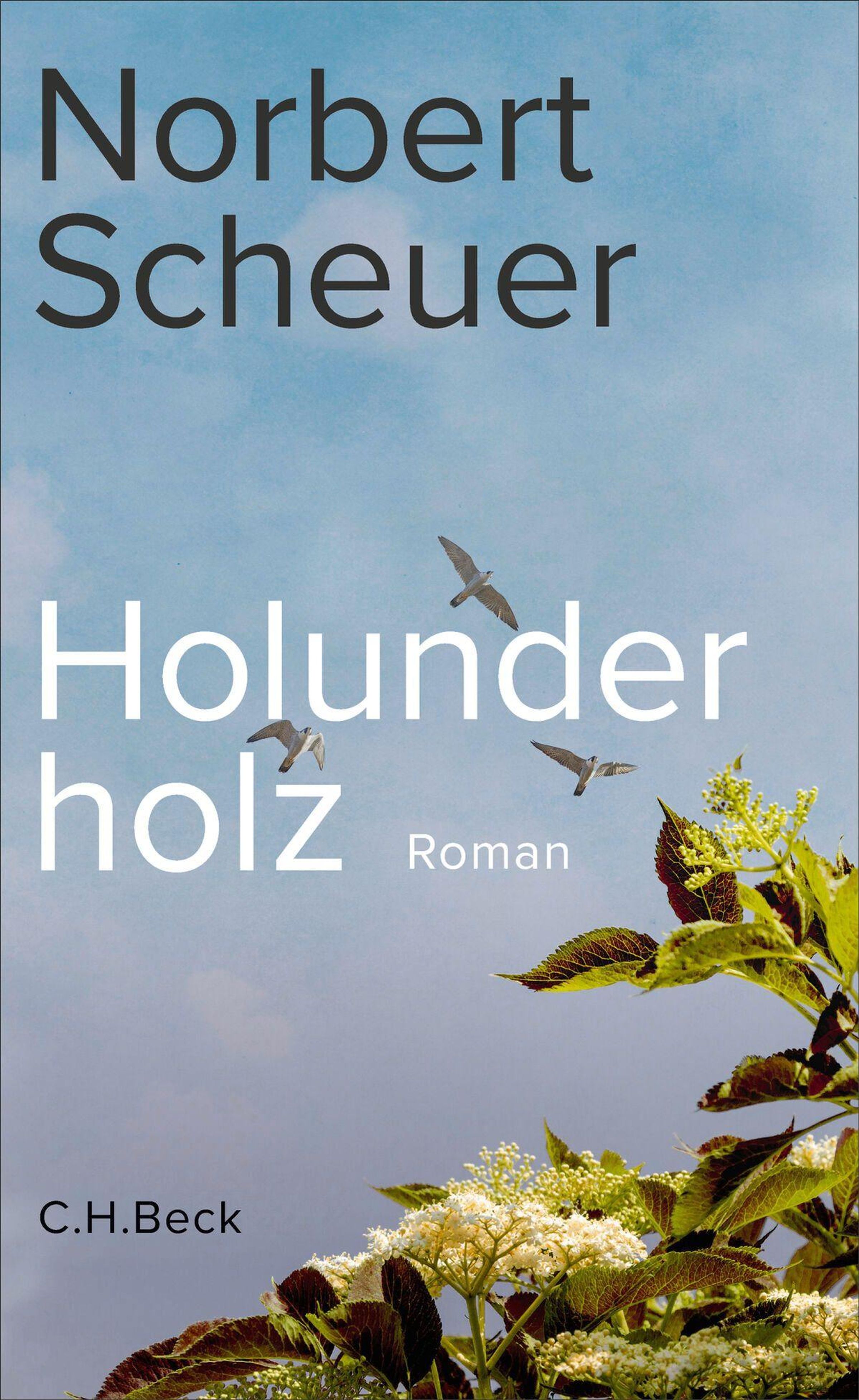 "Norbert Scheuer", "Holunderholz Roman". Blauer Himmel mit fliegenden Vögeln und blühendem Holunder im Vordergrund., Buch