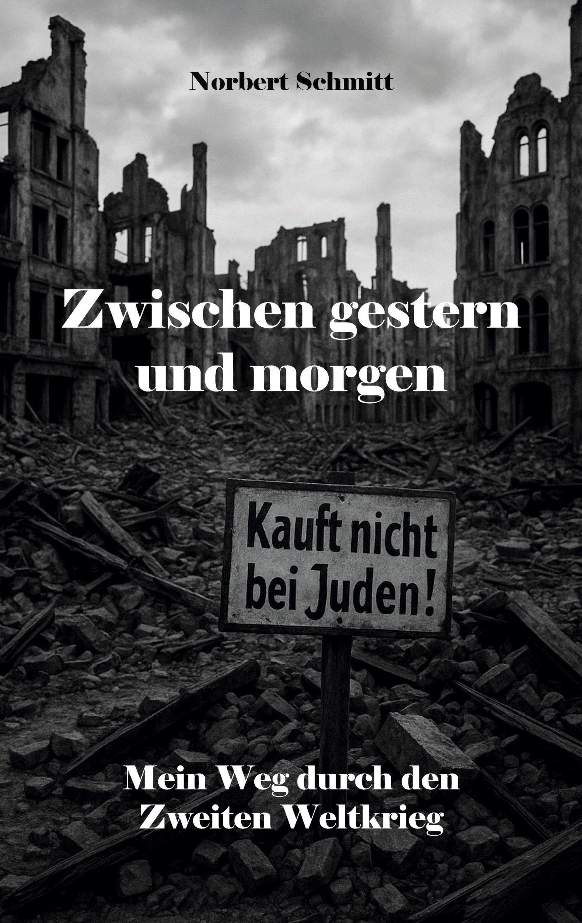Text: „Zwischen gestern und morgen“, „Kauft nicht bei Juden“, „Mein Weg durch den Zweiten Weltkrieg“. Hintergrund: Ruinen., Buch