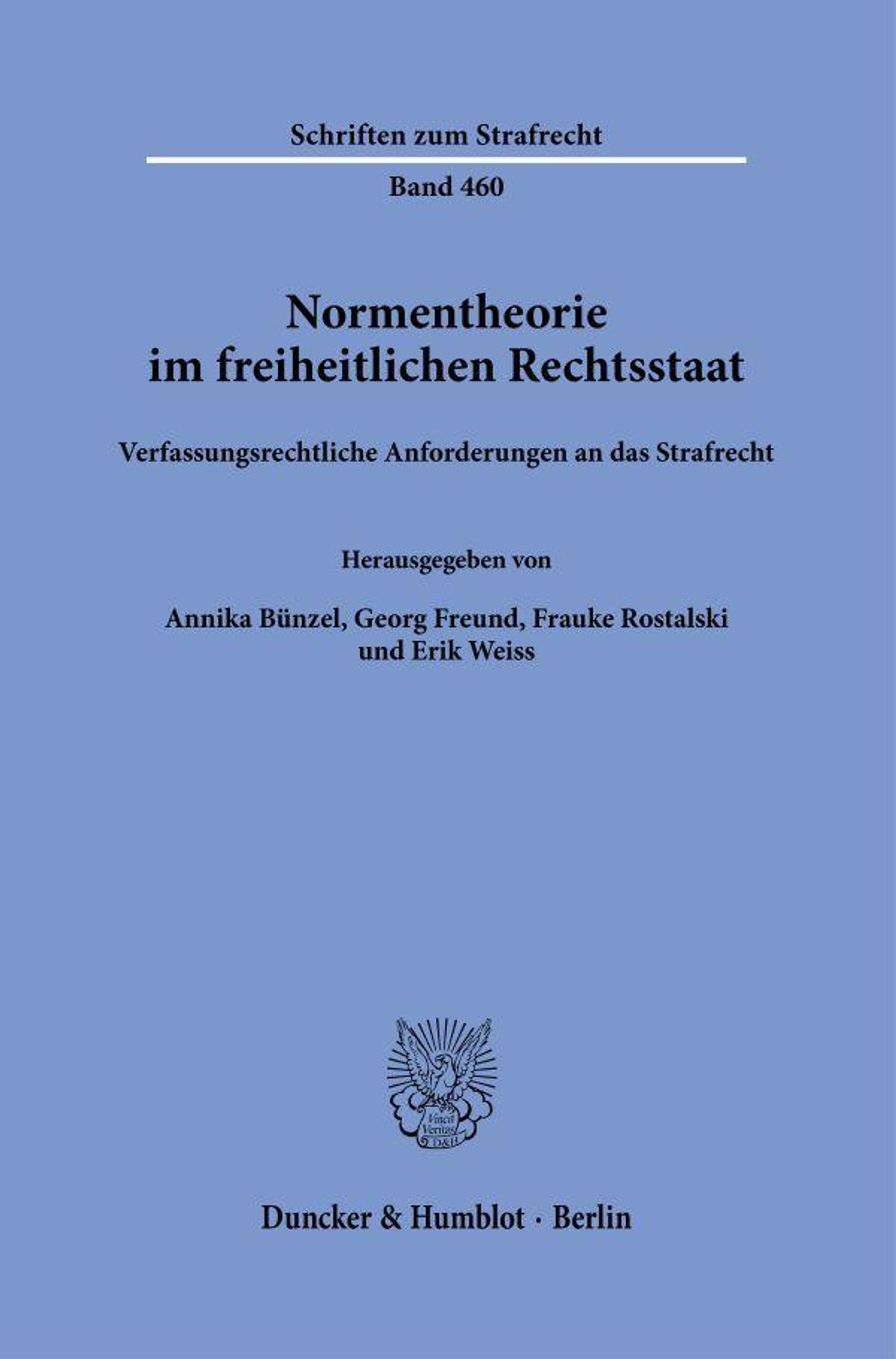 "Normentheorie im freiheitlichen Rechtsstaat" steht im Zentrum auf blauem Hintergrund. Unten das Logo von Duncker & Humblot., Buch