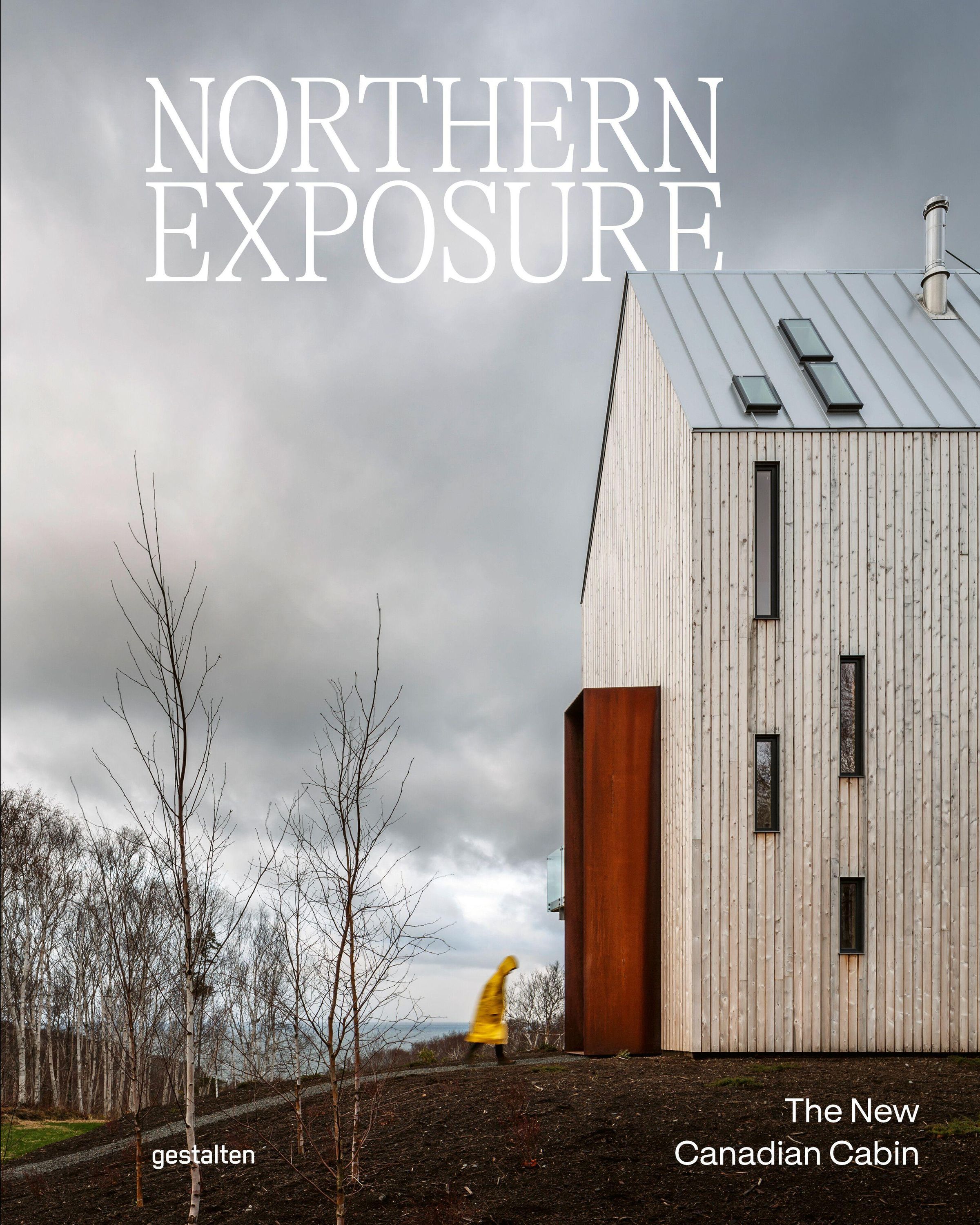 Oben: "NORTHERN EXPOSURE". Unten links: "gestalten". Unten rechts: "The New Canadian Cabin". Moderne Hütte, bewölkter Himmel, Person in Gelb., Buch