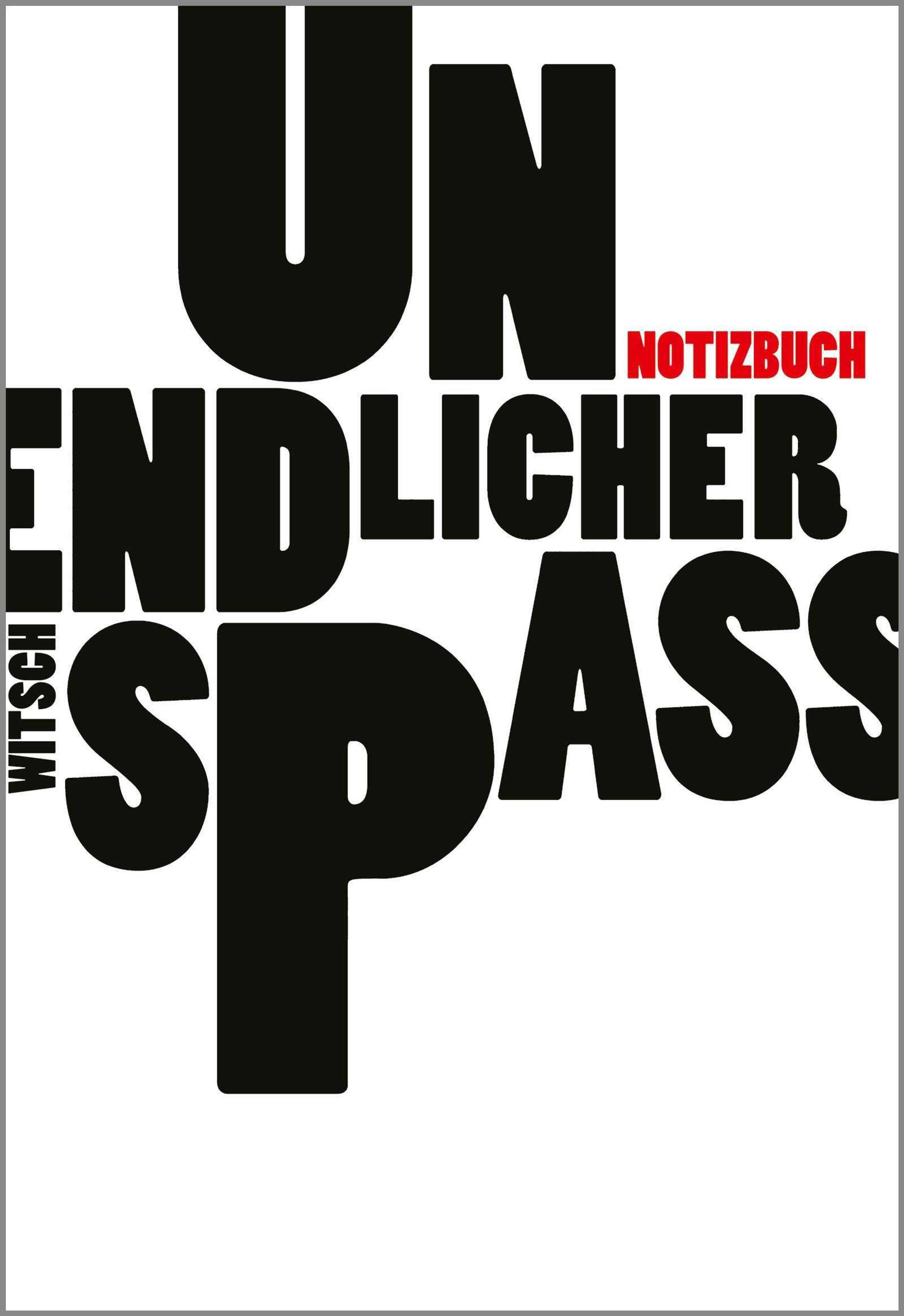 Wörter "UNENDLICHER SPASS" und "NOTIZBUCH" in großem, schwarzen und teils roten Blockbuchstaben auf weißem Hintergrund., Buch