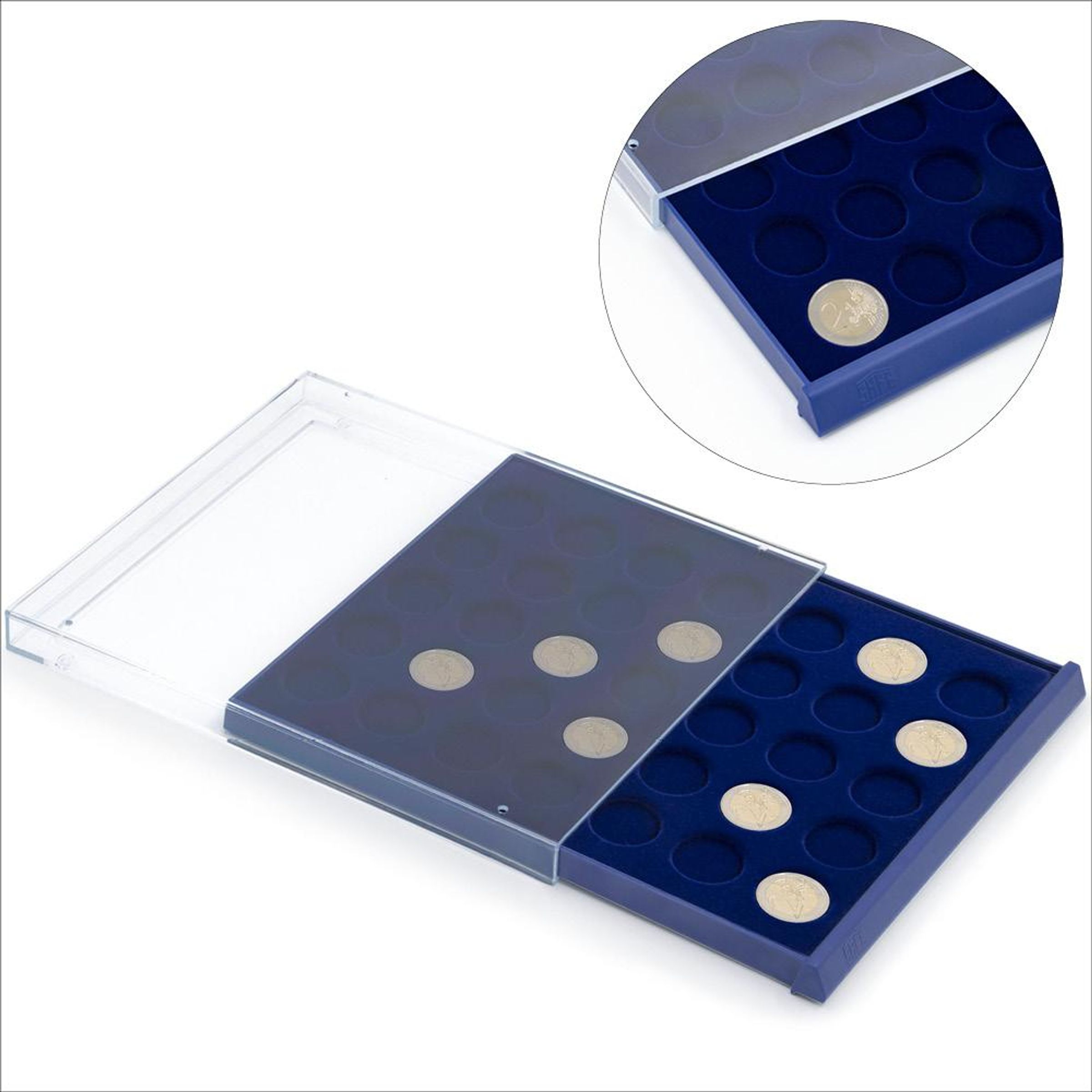 Schubladen-Elemente für Ihre Münzsammlung. Für Münzdurchmesser 26 mm, zum Beispiel 35 mal 2 Euro.