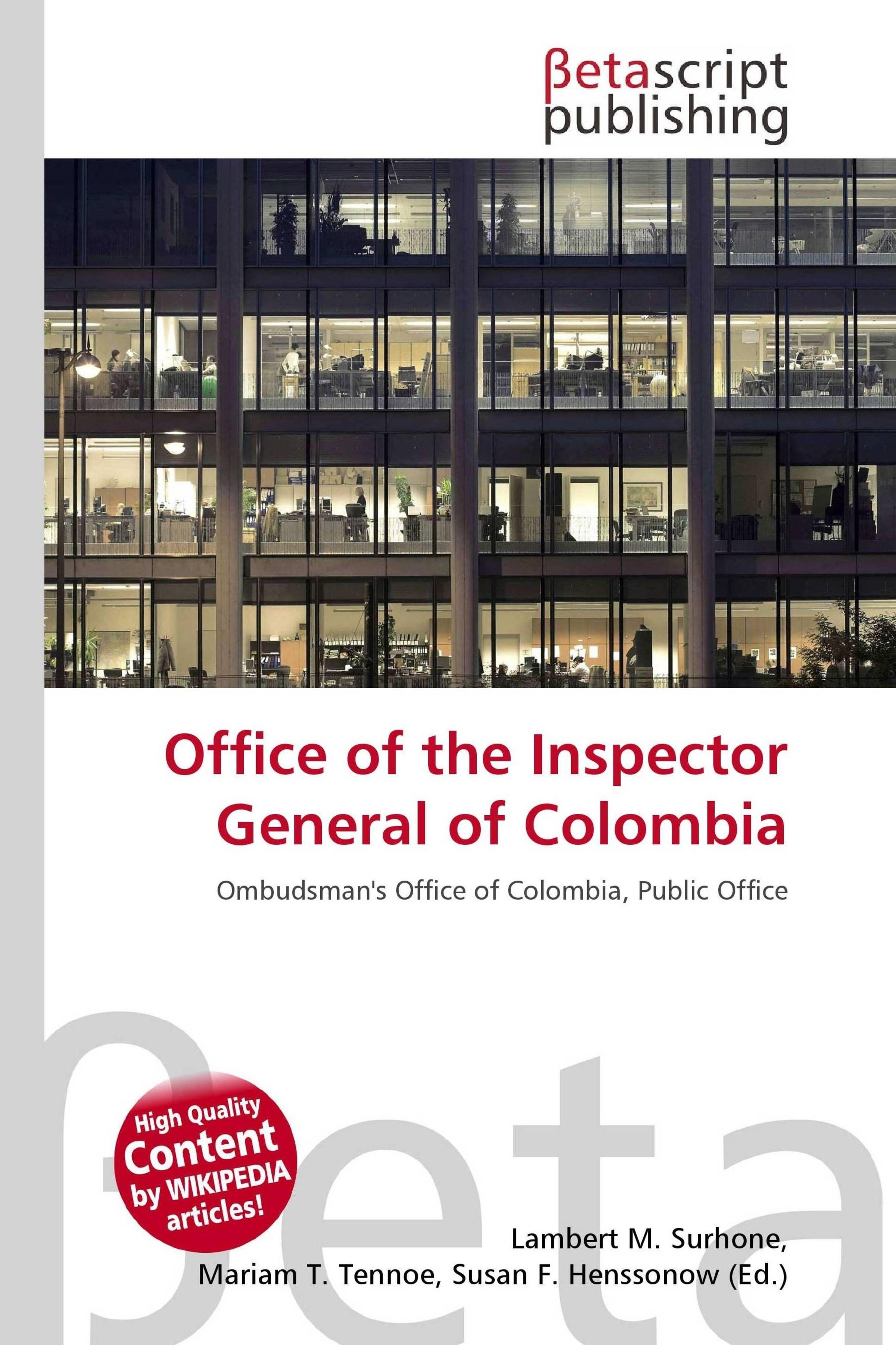 Please note that the content of this book primarily consists of articles available from Wikipedia or other free sources online. The Office of the Inspector General of Colombia (Spanish: Procuraduría General de Colombia) is a Colombian independent, public institution overseeing the public conduct of those in authority or in charge of exercising a public office, and of overseeing the correct functioning of other government institutions and agencies. The Office of the Inspector General of Colombia is not a judicial institution, it is one of the Colombian Control Institutions, alongside the Office of the Controller General. The Inspector General is also charged with safeguarding the rights of the people, guaranteeing Human Rights protection and intervening in the name of the people in the defence of the public's interest.