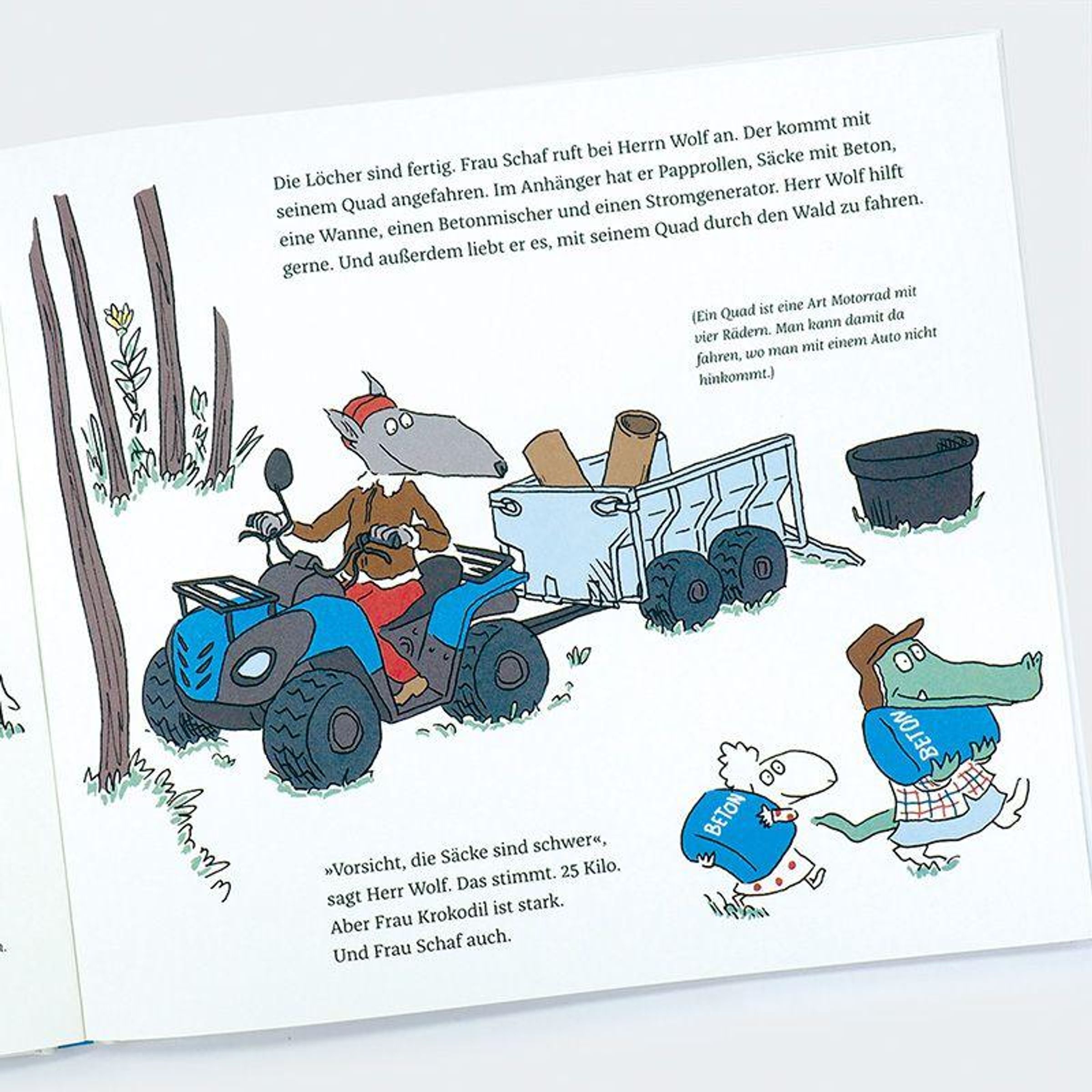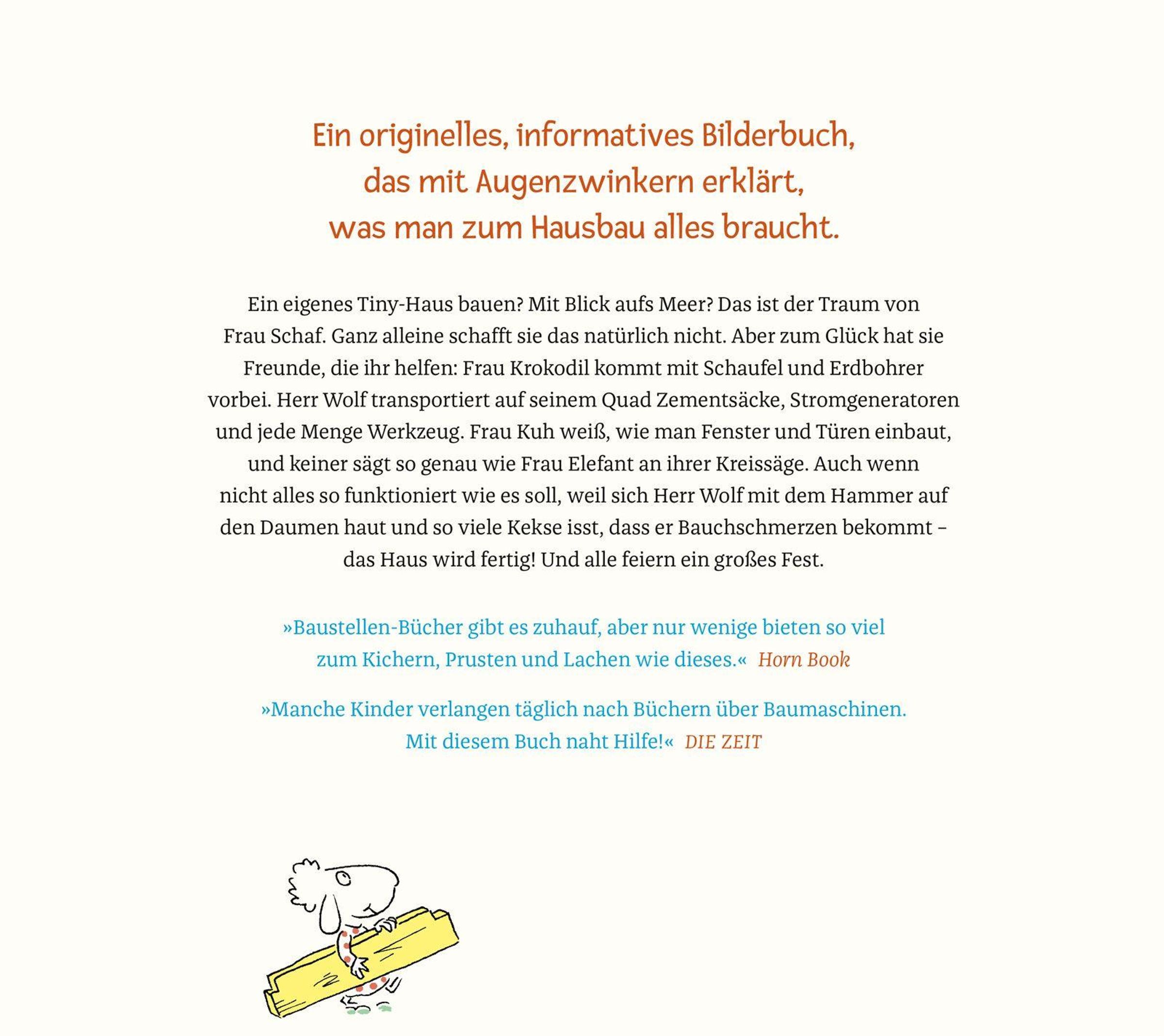 Ein eigenes Tiny House bauen? Mit Blick aufs Meer? Das ist der Traum von Frau Schaf. Ganz allein schafft sie das natürlich nicht. Aber zum Glück hat sie Freunde, die ihr helfen: Frau Elefant kommt mit Schaufel und Erdbohrer vorbei. Herr Wolf transportiert auf seinem Quad Zementsäcke, Stromgeneratoren und jede Menge Werkzeug. Frau Kuh weiß, wie man mit einer Flex umgeht, und keiner sägt so genau wie Frau Krokodil mit ihrer Kreissäge. Auch wenn nicht alles so funktioniert, wie es soll, weil sich Herr Wolf mit dem Hammer auf den Daumen haut und so viele Kekse isst, dass er Bauchschmerzen bekommt - das Haus wird fertig! Und alle feiern ein großes Fest. - Ein originelles, informatives Bilderbuch, das mit Augenzwinkern erklärt, was man zum Hausbau alles braucht.