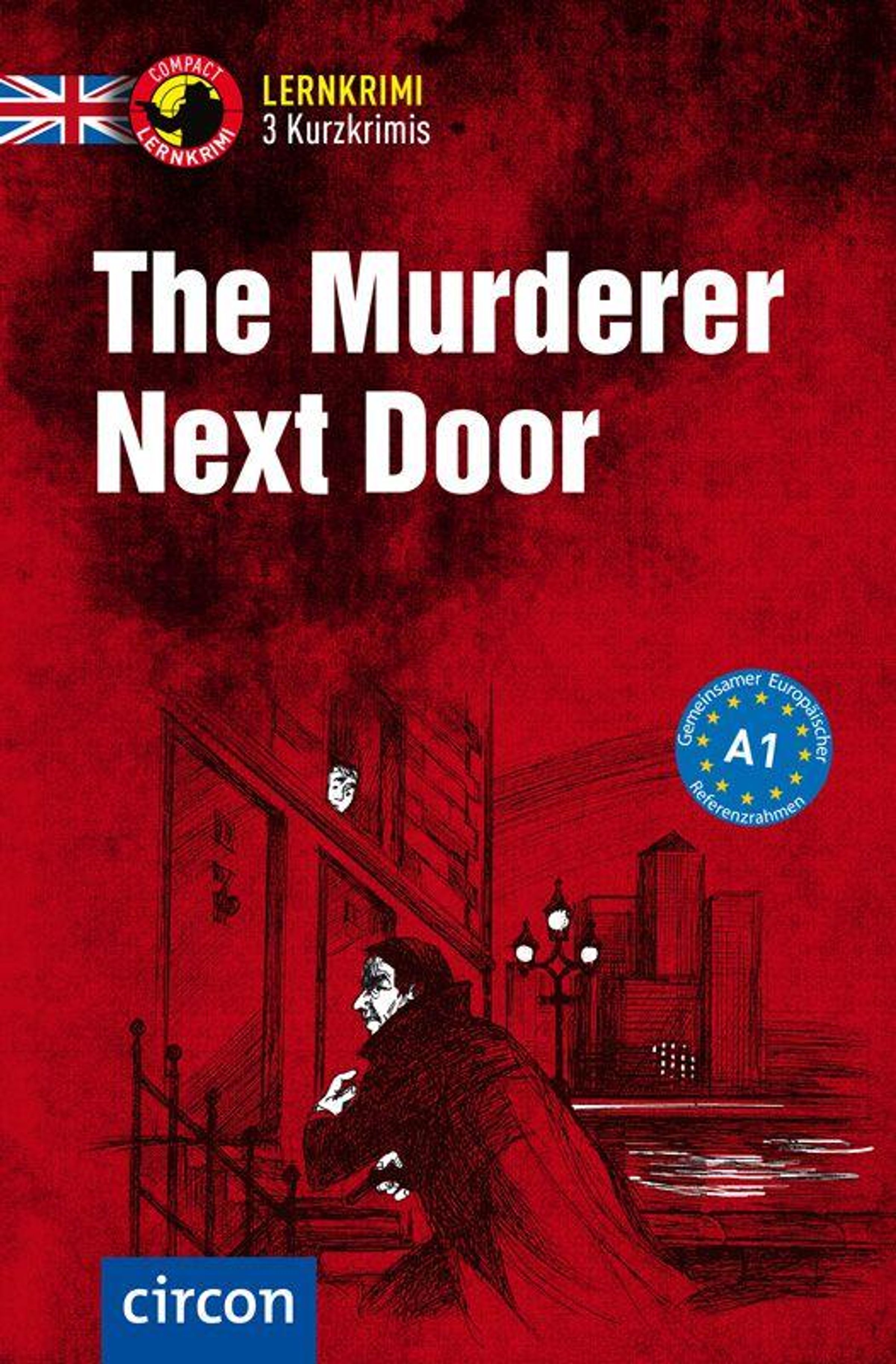 "The Murderer Next Door" steht groß auf rotem Hintergrund. Illustration eines Mannes in Winterkleidung bei Nacht., Buch