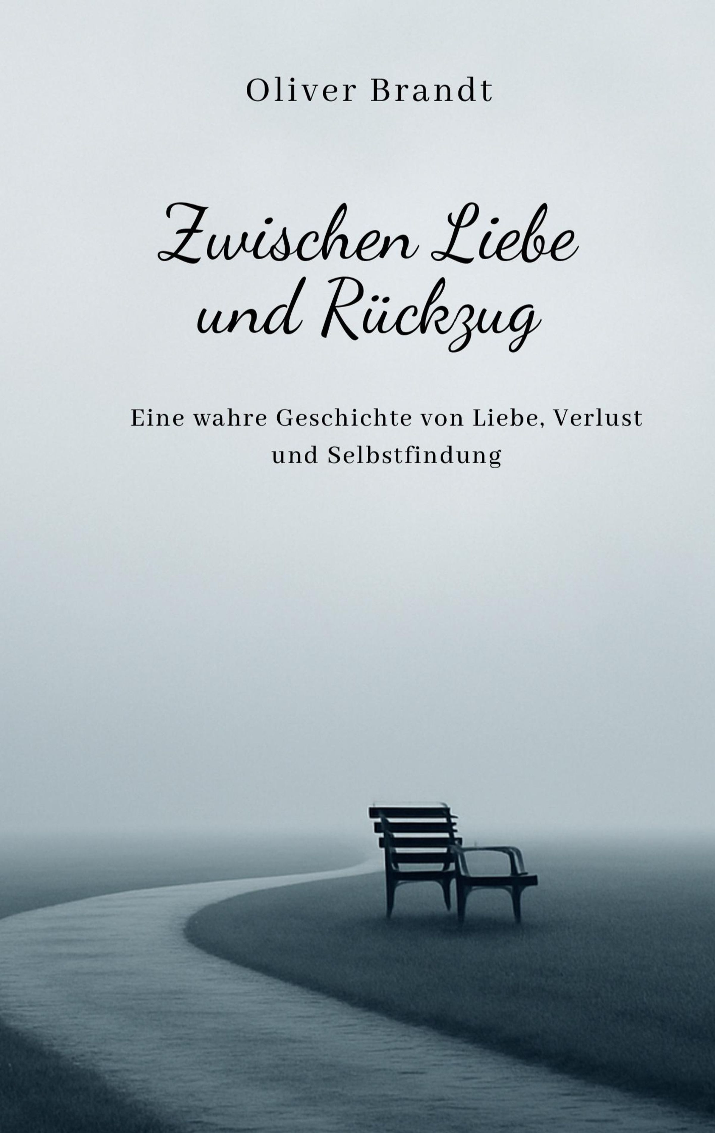 Oliver Brandt: "Zwischen Liebe und Rückzug". Untertitel: "Eine wahre Geschichte von Liebe, Verlust und Selbstfindung". Nebel, Parkbank., Buch
