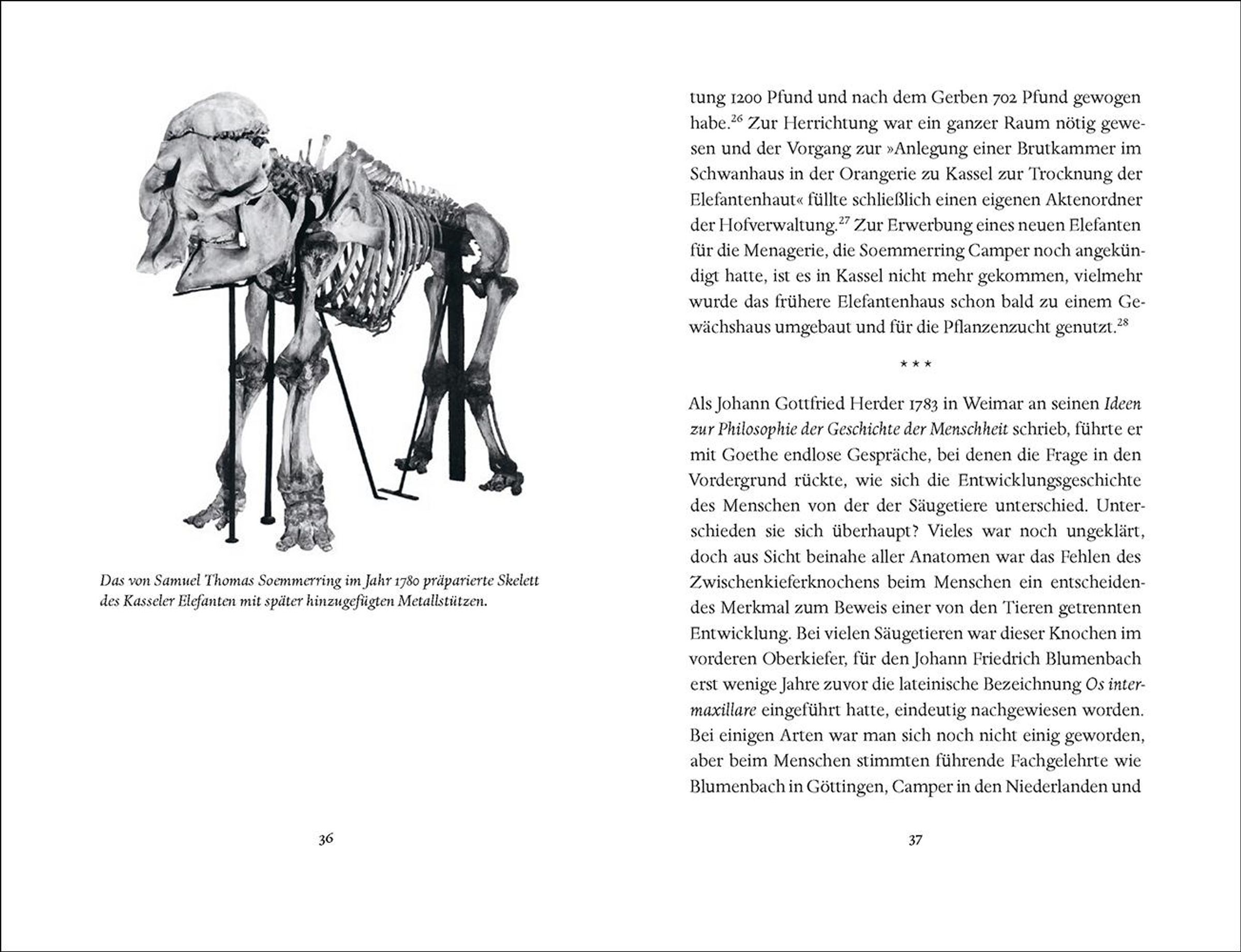 Im Frühjahr 1784 war Johann Wolfgang Goethe auf der Suche nach Elefanten. Gerade erst hatte er als Laie auf dem Gebiet der Anatomie gezeigt, dass Menschen und Tiere viel enger miteinander verwandt waren, als Wissenschaft und Kirche es gelehrt hatten. In seiner Begeisterung über den gelungenen Nachweis des Zwischenkieferknochens beim Menschen wollte er sich nun auch mit dem Knochenbau von Elefanten beschäftigen - der selbst Fachleuten einige Rätsel aufgab. Für seine Forschungen scheute Goethe keine Mühen und ließ sich sogar einen Elefantenschädel quer durch das Land zusenden. Mit aufwendigen Zeichnungen fasste er die Ergebnisse seiner Arbeit zusammen und forderte mit seinem neuen Blick auf die Entwicklungsgeschichte die Fachgelehrten seiner Zeit heraus.