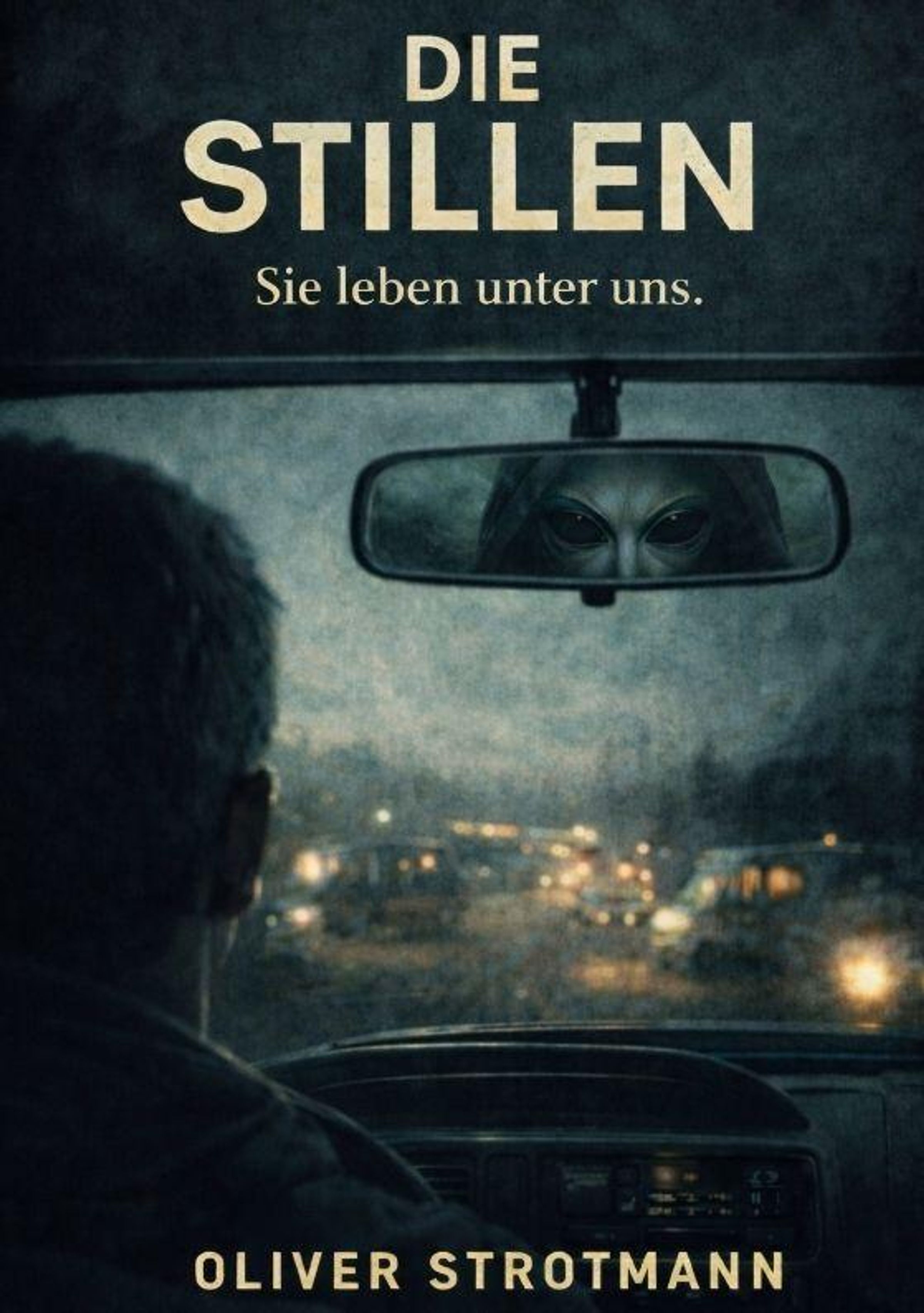"Die Stillen. Sie leben unter uns. Oliver Strotmann." Jemand fährt bei Nacht, im Rückspiegel ein außerirdisches Gesicht., Buch