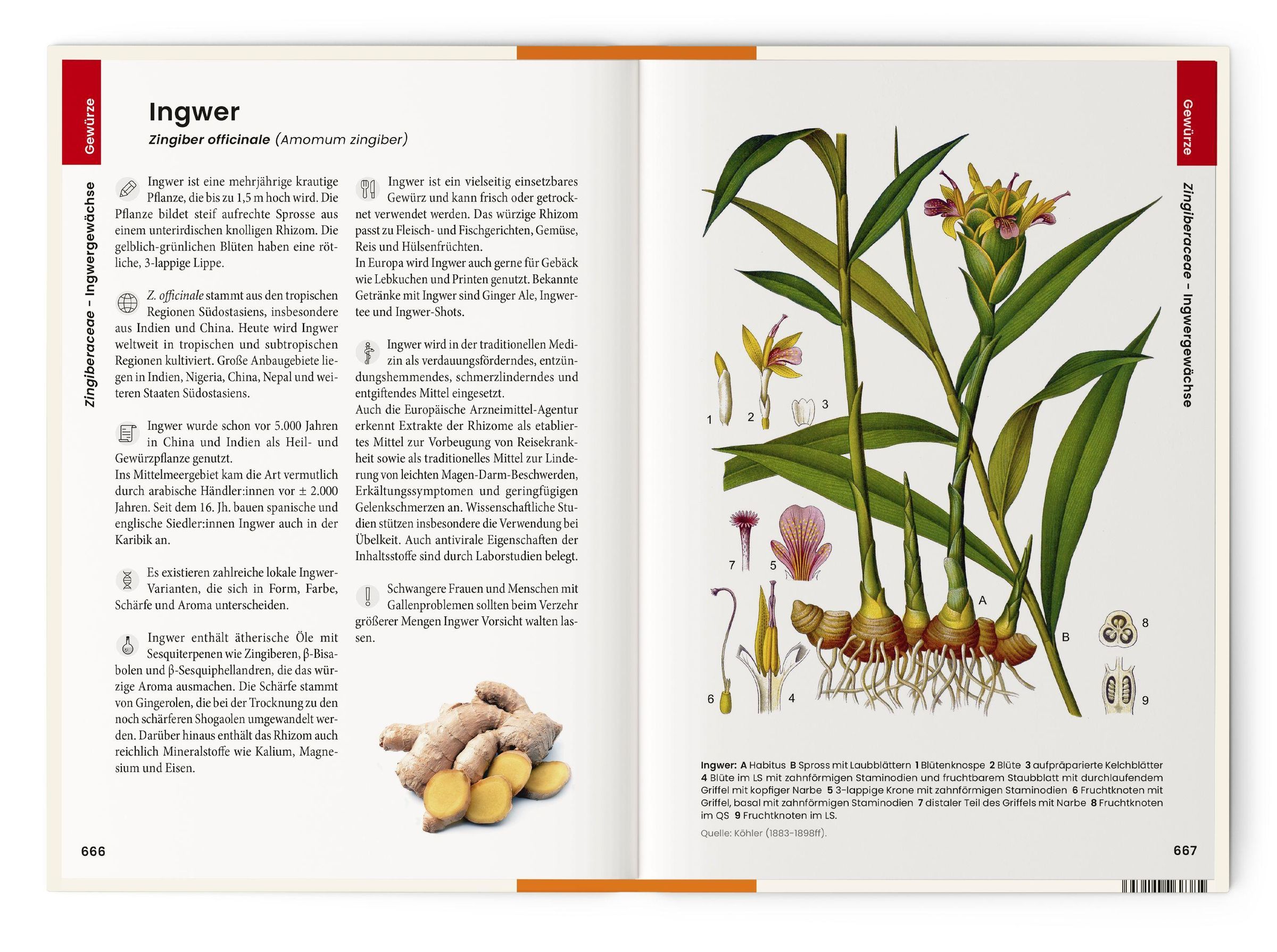 - Großformatige Illustrationen/Abbildungen mit Legende (wissenschaftlicher Name, Pflanzenfamilie, deutsche Pflanzennamen, Handelsnamen, Beschreibung der Vorkommen und Anbaugebiete) plus 2-3 kleine Detai