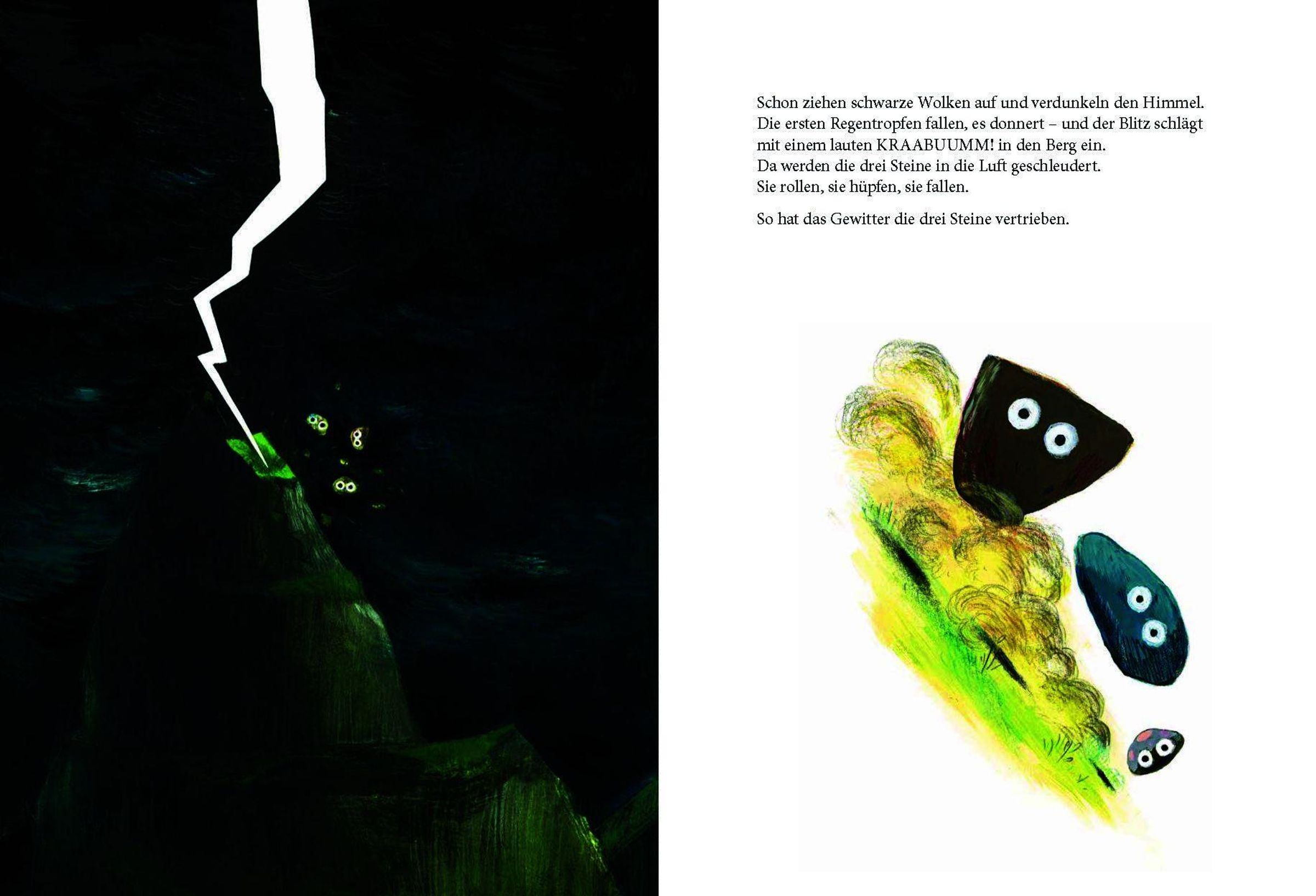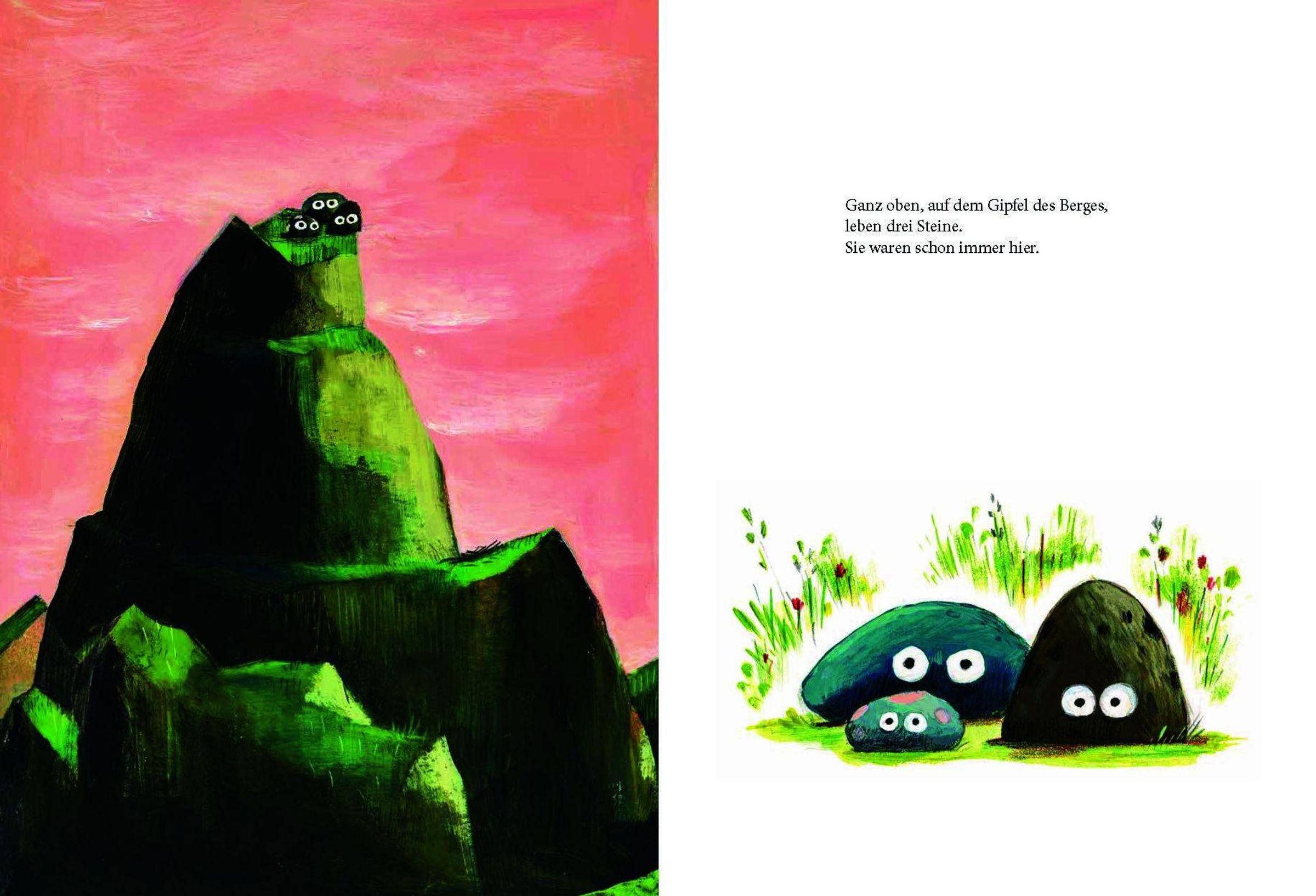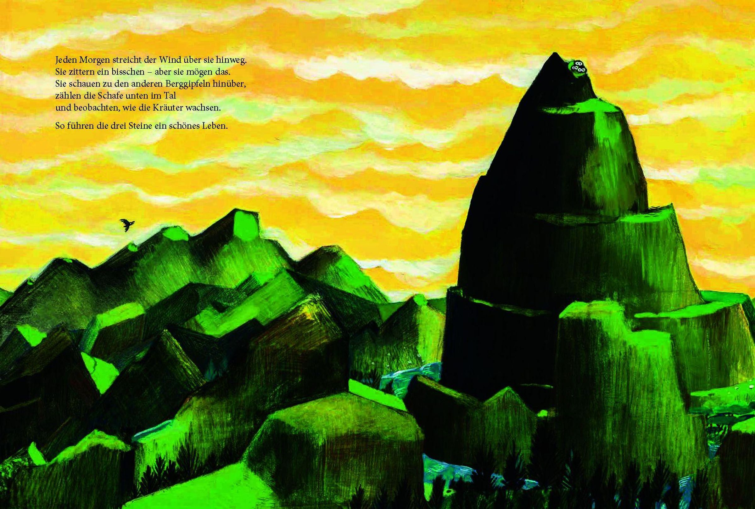 „Die drei Steine“ in gelben Buchstaben. Illustration: Drei Steine mit Augen auf einem grasbewachsenen Hügel., Buch