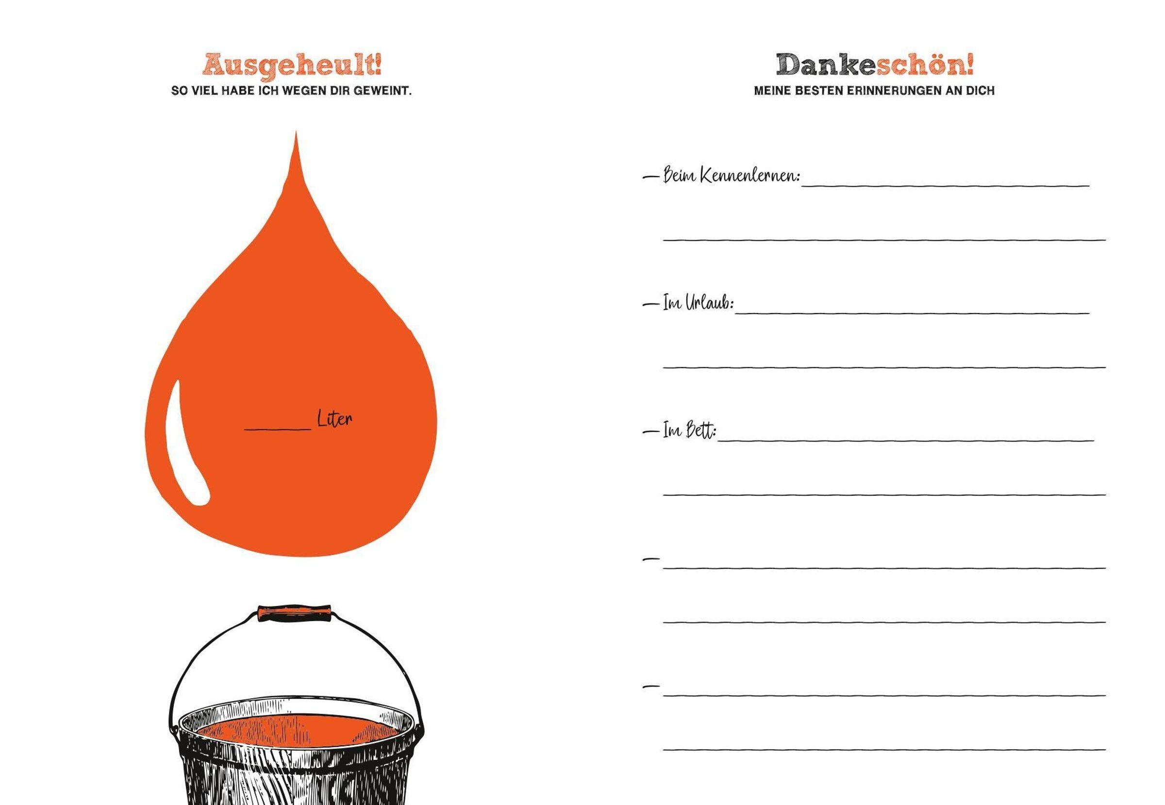 Ob frisch verlassen, mitten in einer komplizierten Phase oder einfach nur frustriert - hier darfst du alles rauslassen! Gestalte das Buchcover deiner Ex-Beziehung, zeichne Millionen von Tränen, schreibe fiese kleine Abschiedsbriefe oder plane dein neues Leben ohne den / die Ex.