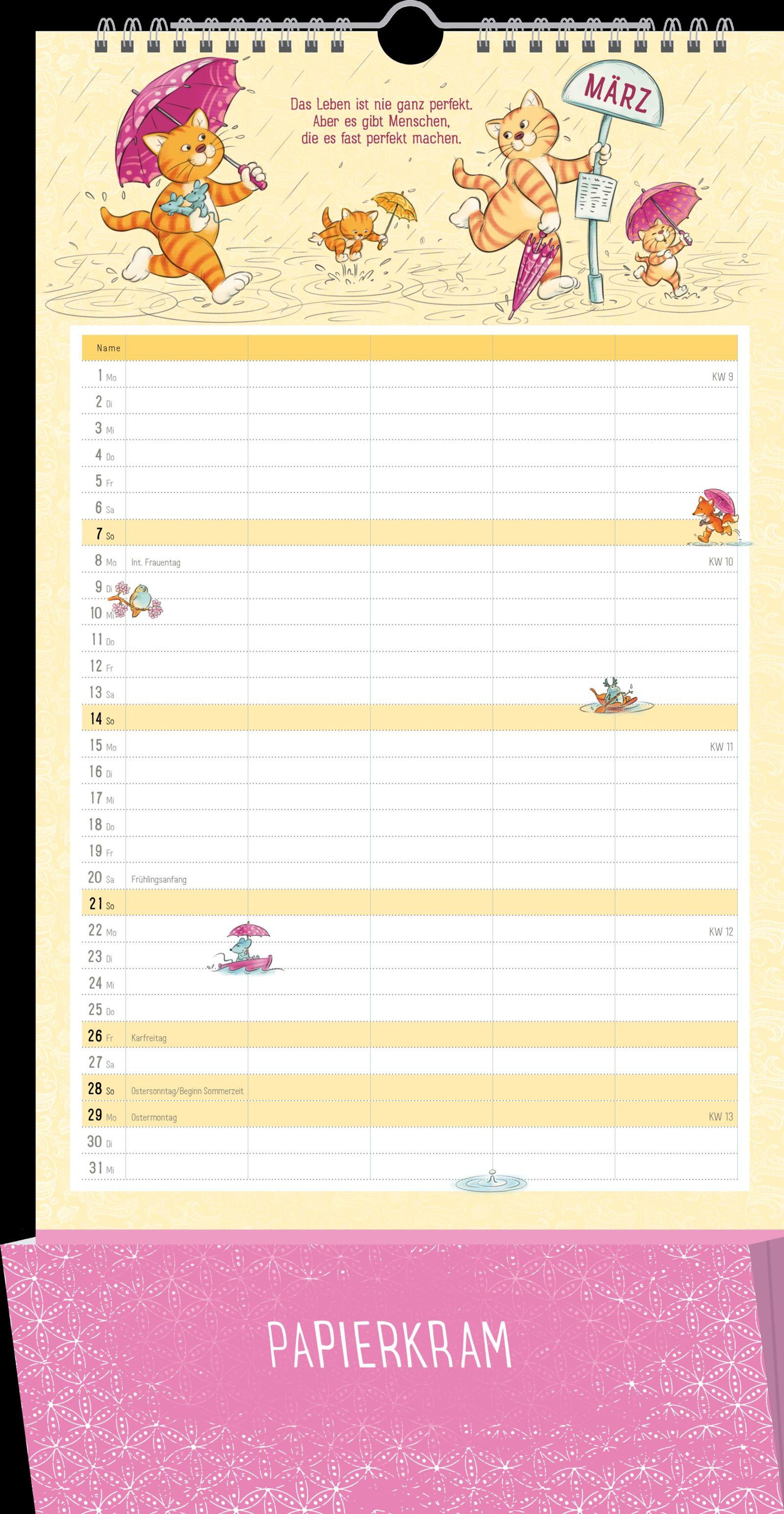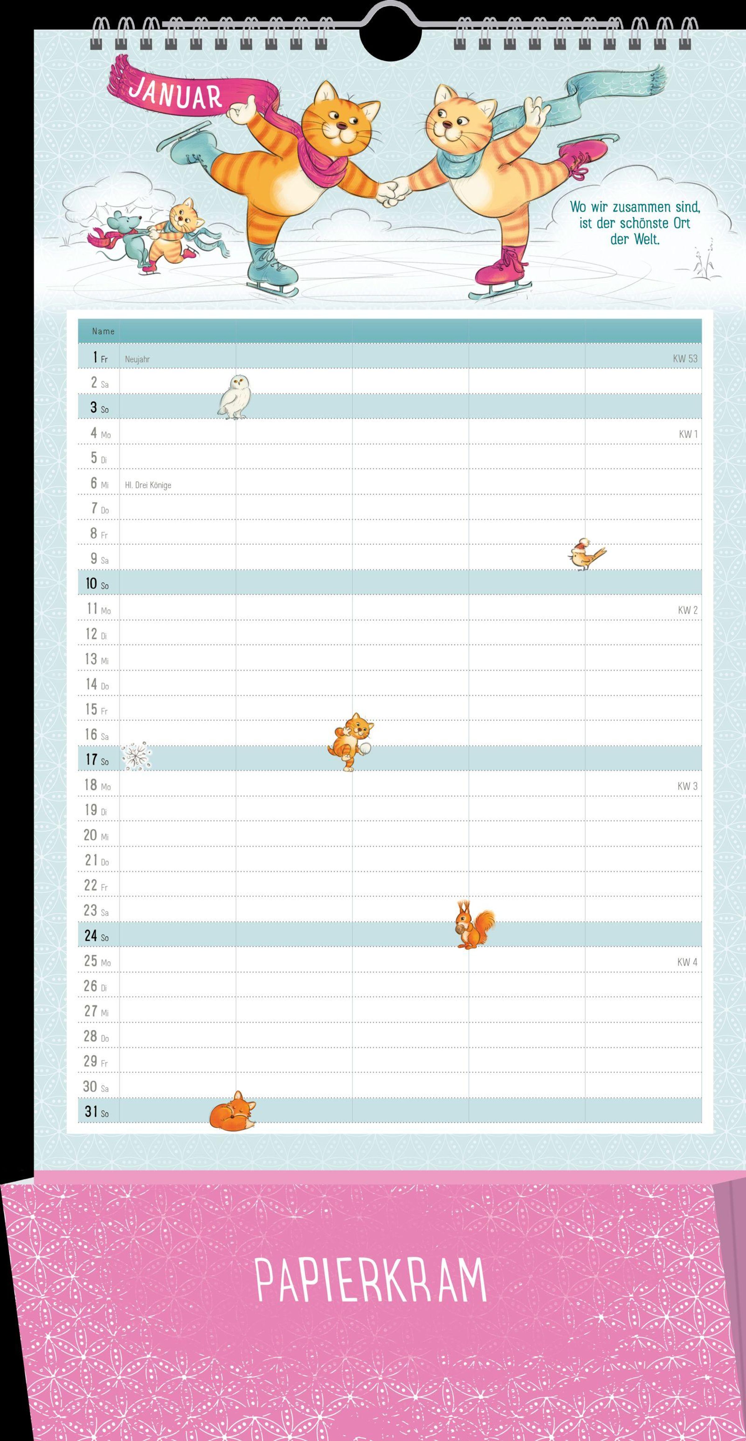 - Format: Hochformat (25 x 52, 3 cm), 12 Monatsblätter, Spiralbindung, Drahtbügel zum Aufhängen