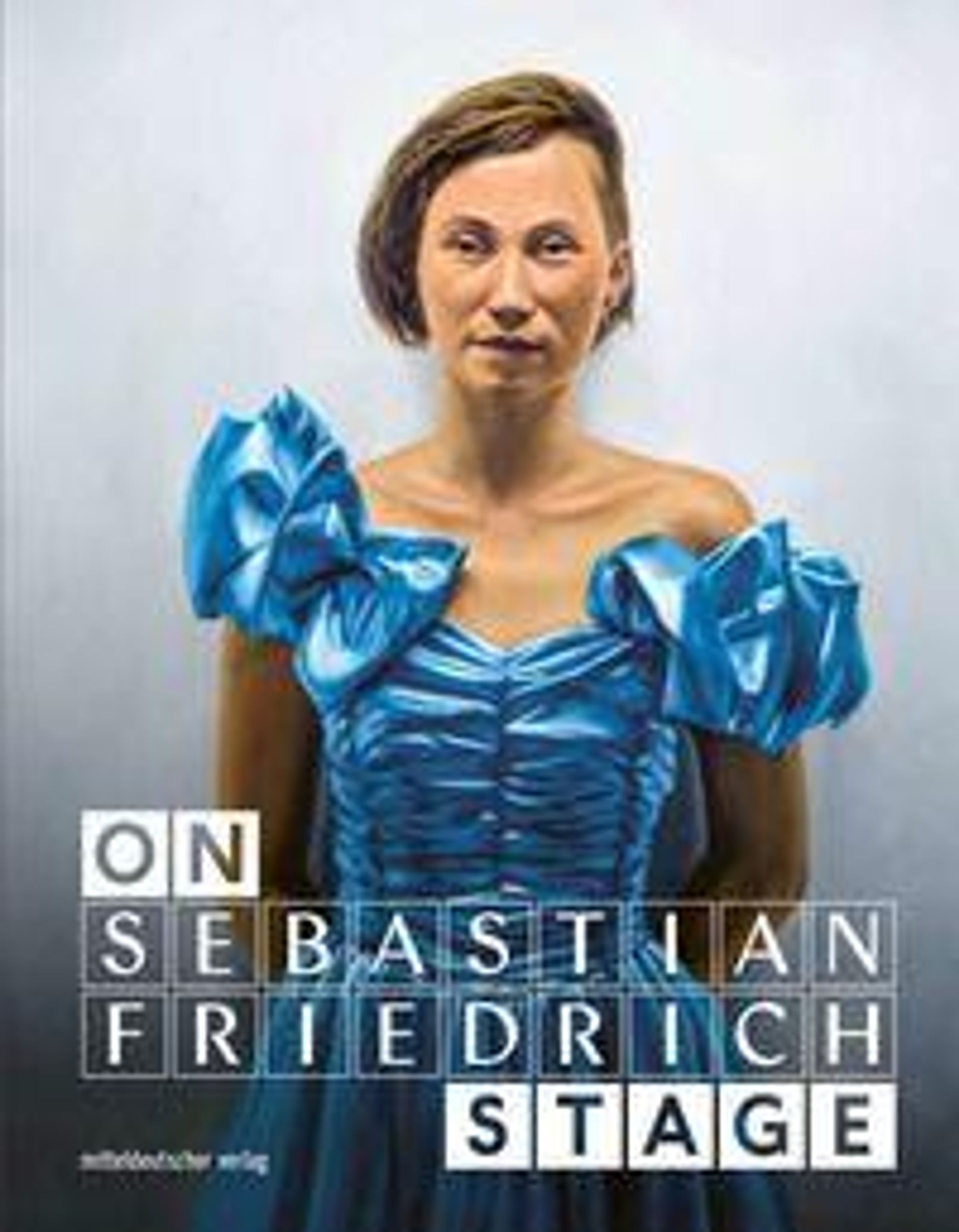 Texte: "ON", "SEBASTIAN FRIEDRICH", "STAGE", "mitteldeutscher verlag". Eine Illustration einer Person in einem blauen Kleid., Buch