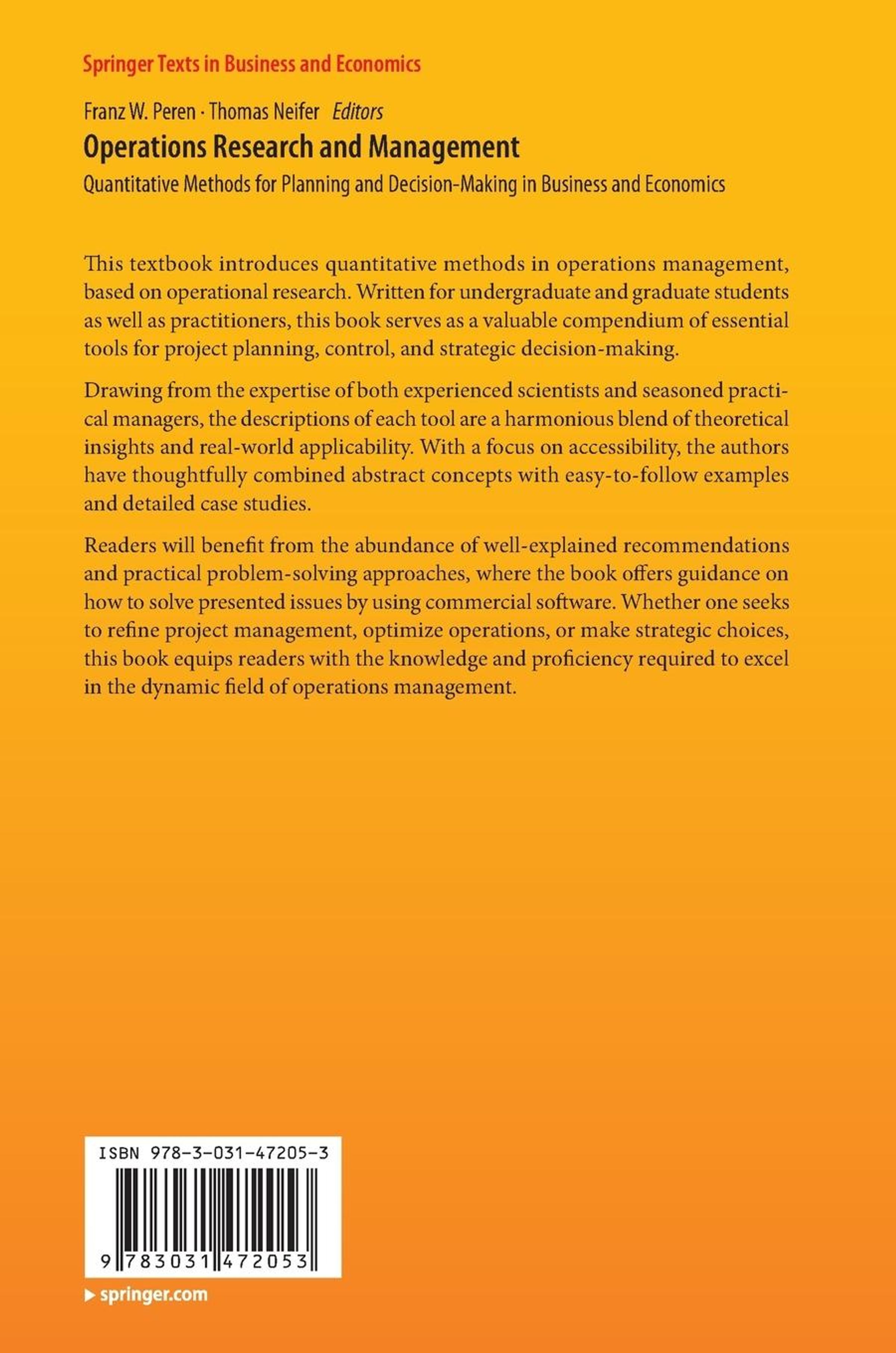 This textbook introduces quantitative methods in operations management, based on operational research. Written for undergraduate and graduate students as well as practitioners, this book serves as a valuable compendium of essential tools for project planning, control, and strategic decision-making. Drawing from the expertise of both experienced scientists and seasoned practical managers, the descriptions of each tool are a harmonious blend of theoretical insights and real-world applicability. With a focus on accessibility, the authors have thoughtfully combined abstract concepts with easy-to-follow examples and detailed case studies.