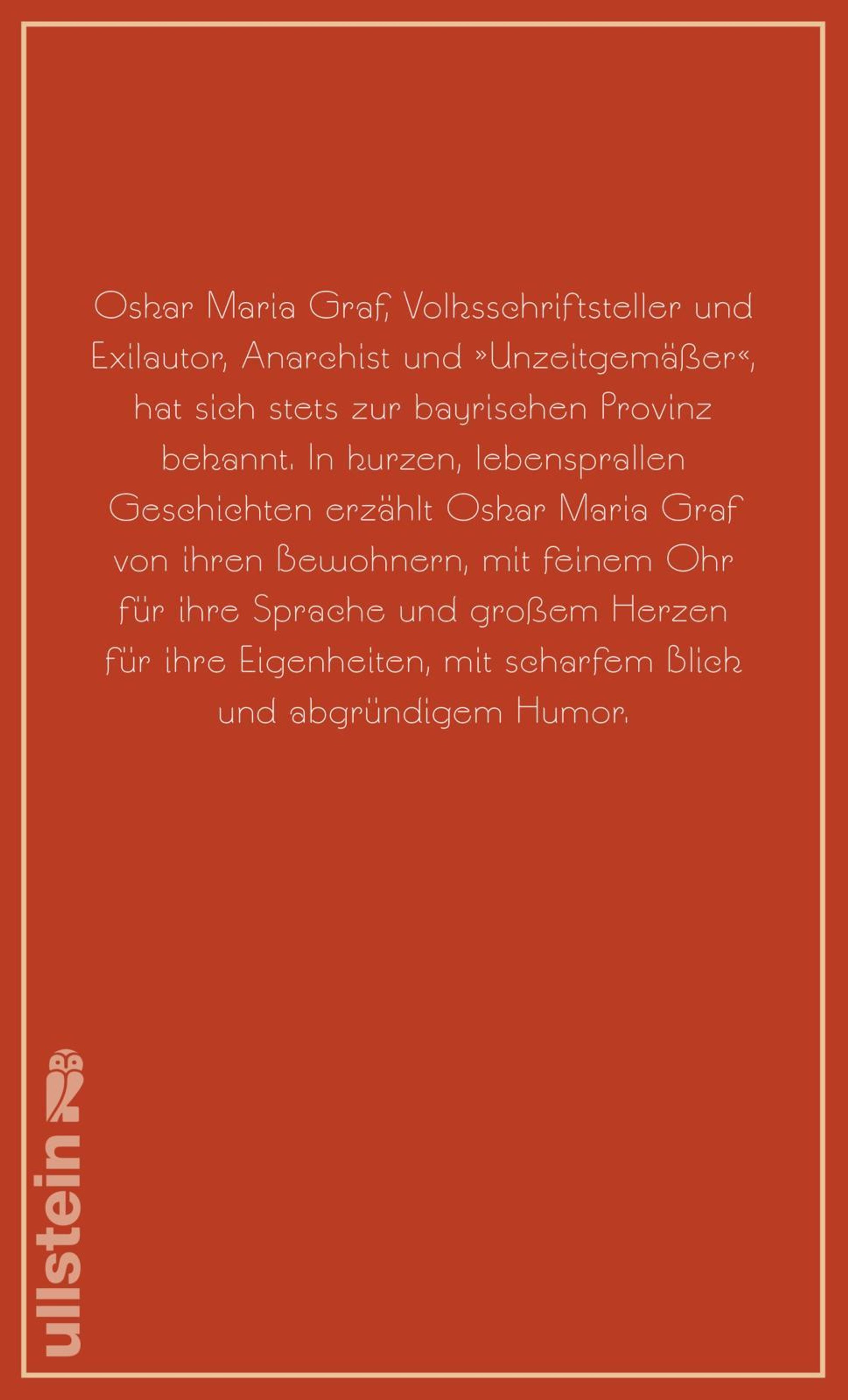 Oskar Maria Graf, Volksschriftsteller und Exilautor, Anarchist und 'Unzeitgemäßer', hat sich stets zur bayrischen Provinz bekannt. In kurzen, lebensprallen Geschichten erzählt Oskar Maria Graf von ihren Bewohnern, mit feinem Ohr für ihre Sprache und großem Herzen für ihre Eigenheiten, mit scharfem Blick und abgründigem Humor.