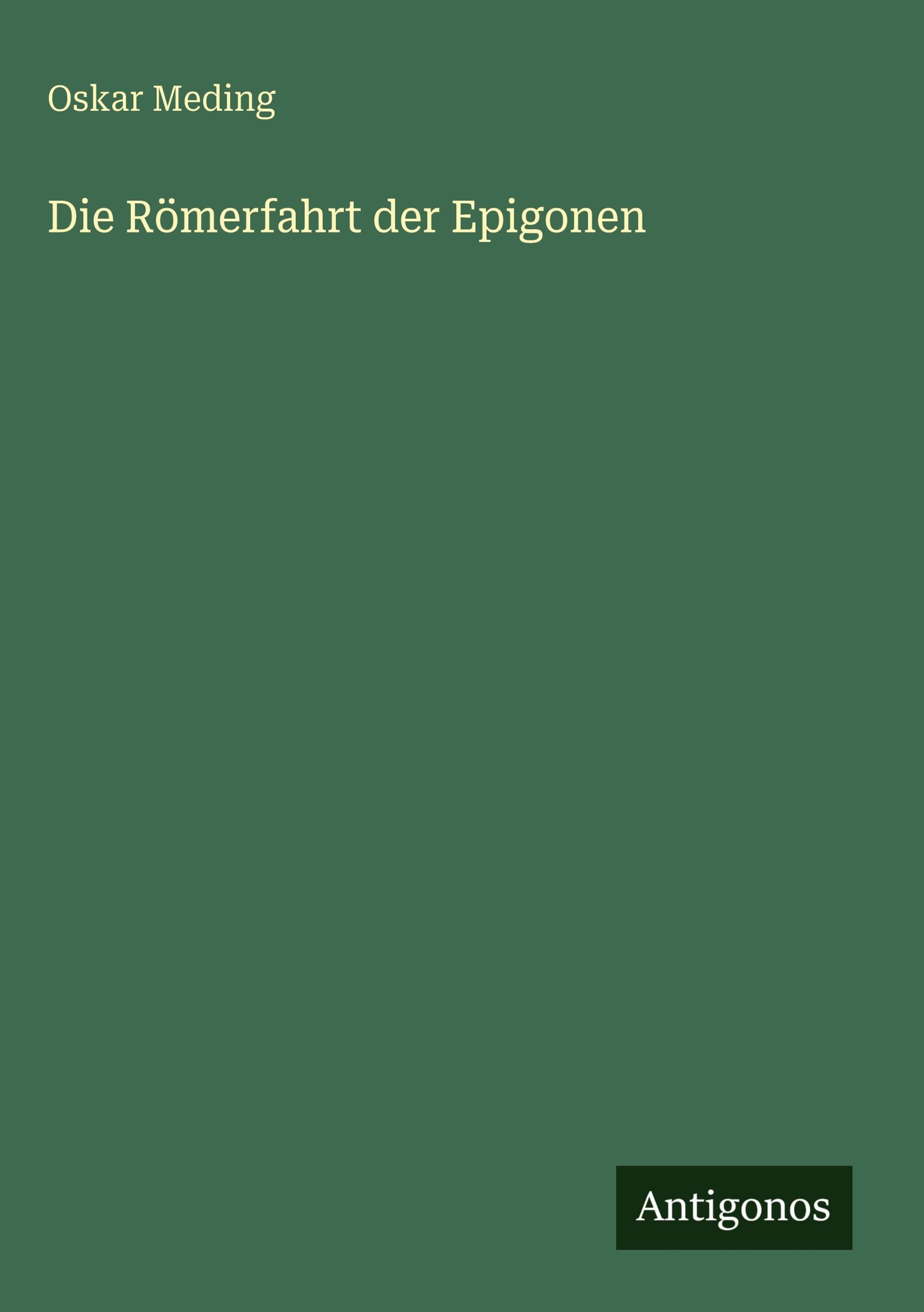 „Oskar Meding, Die Römerfahrt der Epigonen“. Unten rechts steht „Antigonos“. Grüner Hintergrund., Buch