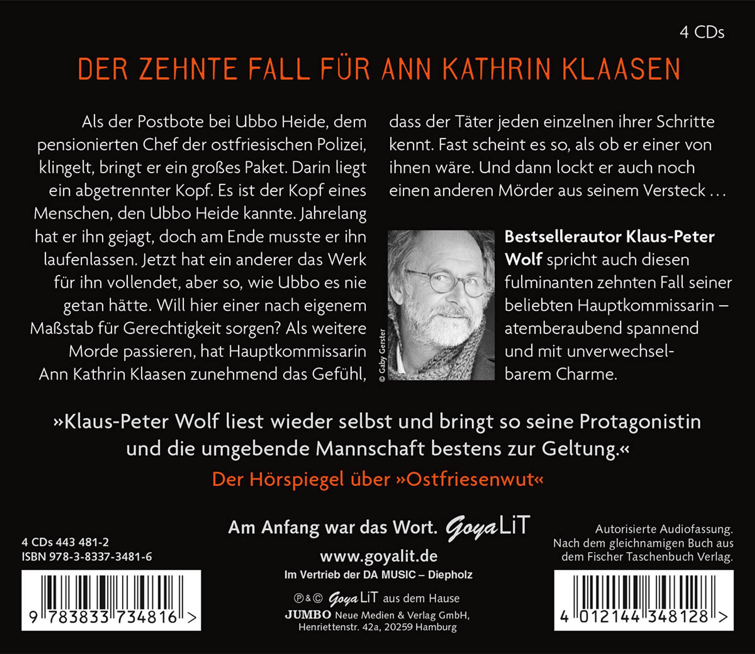 Obwohl längst pensioniert, ist Ubbo Heide für alle bei der Kripo Aurich noch immer der Chef. Auch der neue Kripo-Chef Büscher muss einsehen, dass die ostfriesische Polizei ihre eigenen Hierarchien hat. Als der Postbote an diesem Morgen bei Ubbo Heide klingelt, bringt er ein großes Paket. Darin liegt ein abgetrennter Kopf. Es ist der Kopf eines Menschen, den Ubbo Heide kennt. Jahrelang hat er versucht, ihn seiner gerechten Strafe zuzuführen, musste ihn jedoch laufen lassen. Jetzt hat ein anderer das Werk für ihn vollendet, aber so, wie Ubbo es nie getan hätte. Wenig später findet man einen zweiten Kopf. Auch diesem Toten konnte man damals seine Tat nicht nachweisen. Will hier jemand die Arbeit der Polizei übernehmen? Bestseller-Autor Klaus-Peter Wolf spricht den zehnten Fall der beliebten Nordsee-Kommissarin Ann Kathrin Klaasen mit seinem besonderen Charme und ist auf diese Weise seinen Figuren so nah wie keiner sonst. Das gleichnamige Buch ist im Fischer Taschenbuch Verlag erschienen.Biografie