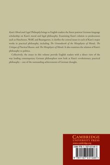 This volume brings to English readers the finest postwar German-language scholarship on Kant's moral and legal philosophy. Examining Kant's relation to predecessors such as Hutcheson, Wolff, and Baumgarten, it clarifies the central issues in each of Kant's major works in practical philosophy, including The Groundwork of the Metaphysics of Morals, The Critique of Practical Reason, and The Metaphysics of Morals. It also examines the relation of Kant's philosophy to politics. Collectively, the essays in this volume provide English readers with a direct view of how leading German philosophers are now regarding Kant's revolutionary practical philosophy, one of the outstanding achievements of German thought.