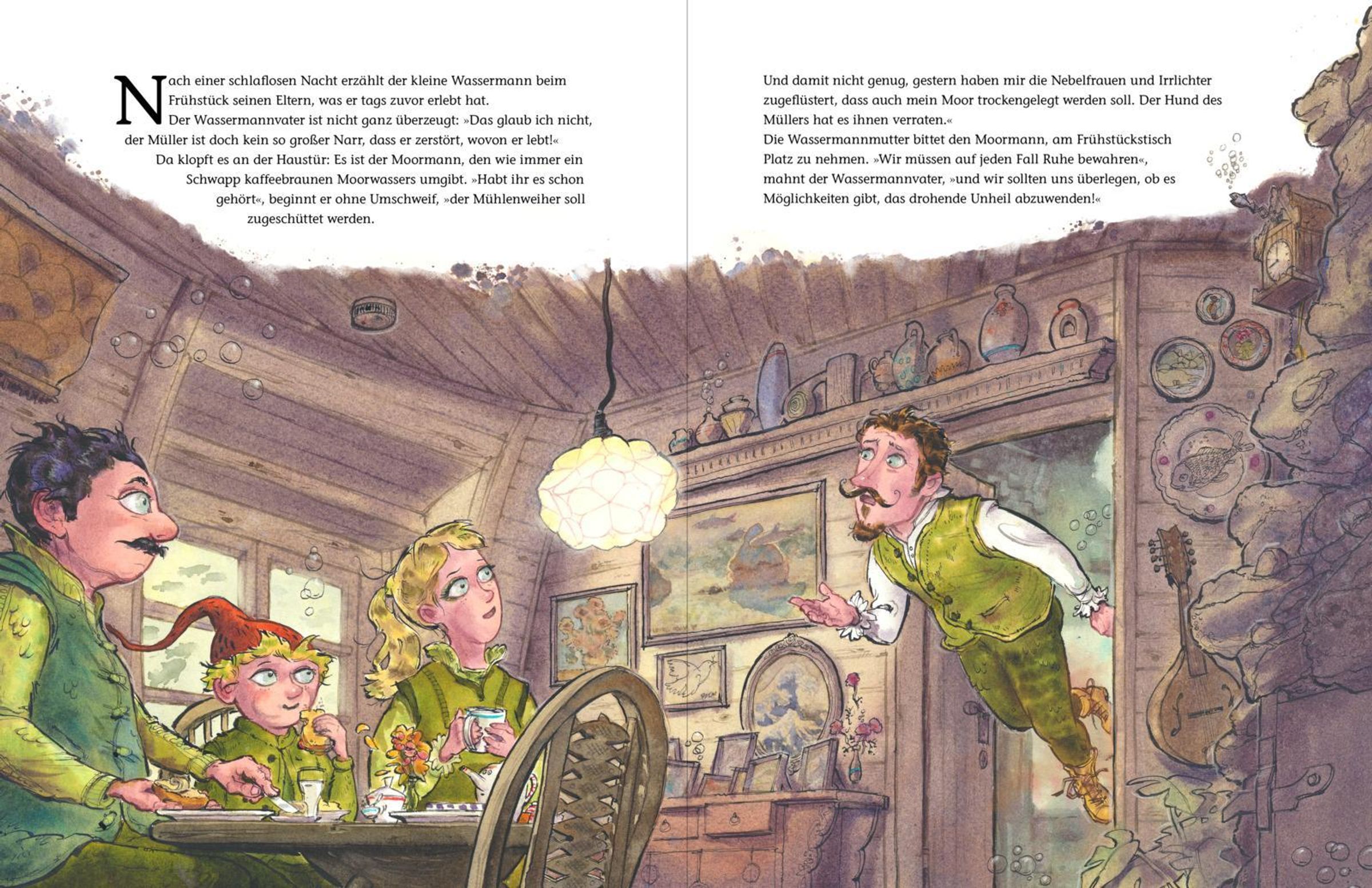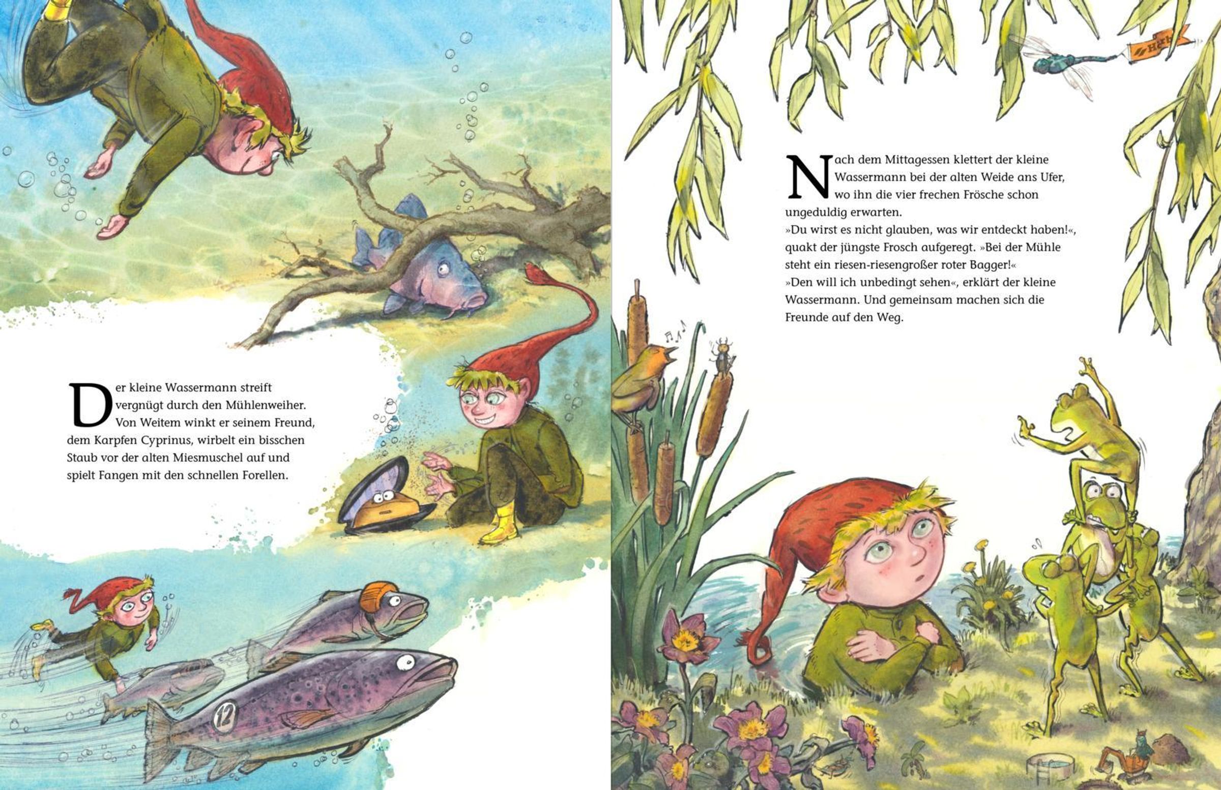 Als eines Tages ein riesiger roter Bagger am Mühlenweiher auftaucht, gerät die friedliche Unterwasserwelt des kleinen Wassermanns völlig durcheinander. Soll der Weiher wirklich zugeschüttet werden? Gemeinsam mit seinem Vater und dem Moormann macht sich der kleine Wassermann auf eine Reise voller Überraschungen - bis hin zum alten Brunnenmann, der vielleicht die Antwort kennt.