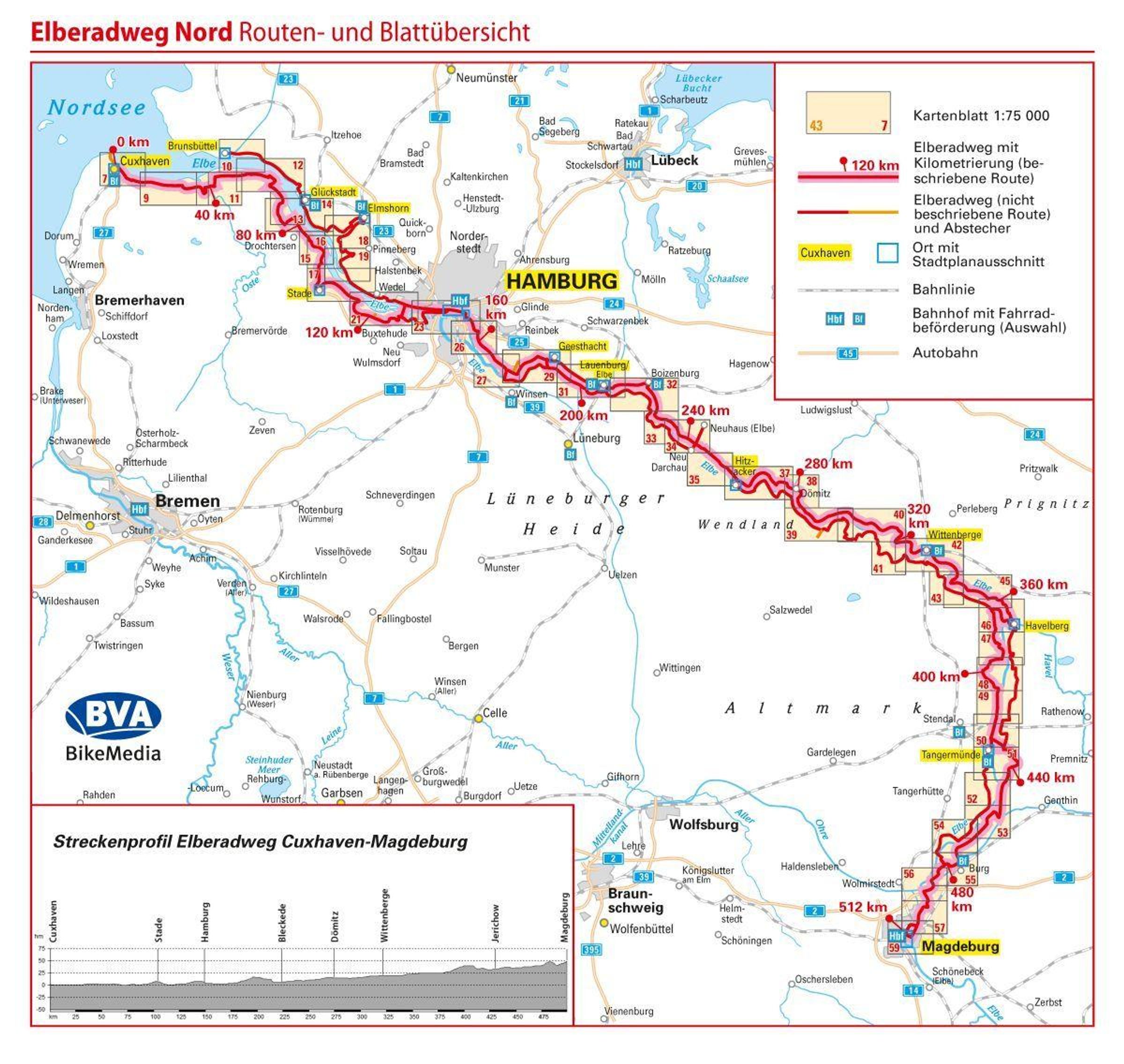 Finden Sie sicher den Weg .durch Wegbeschreibungen & bewährte, detaillierte BVA-Kartograpie: * Angaben zu Oberflächen & Verkehrsbelastung * durchgehende Kilometrierung * zahlreiche Stadtpläne * ausgewählte Straßennamen * zum Kartenausschnitt passende Wegbeschreibung * kostenlose GPS-Tracks der Route als Download Finden Sie immer ein Dach über dem Kopf! .durch das umfangreiche Übernachtungsverzeichnis Entdecken Sie die Sehenswürdigkeiten! . im separaten Reiseführerteil Seien Sie immer für den Ernstfall gerüstet! . mit dem Fahrradwerkstattverzeichnis Besonders einfache Handhabung durch Komfort-Konzept: * Kein lästiges Herumblättern! Zusammengehörende Karten und Wegbeschreibungen immer auf einer Doppelseite passend zueinander platziert! * Schwarze Nummernpunkte für Abbiegehinweise in Karte und Wegbeschreibung * Rote Nummernpunkte für die Sehenswürdigkeiten in Karte, Wegbeschreibung und Reiseführerteil * Praktische Umschlagklappen mit Routenübersichtskarte und Legende * Karten durchgängig genordet (kein Drehen des Kartenhalters nötig) praktische Spiralbindung wetter- und reißfestes Papier - der Elberadweg 500 km von der Mündung in Cuxhaven bis Magdeburg - Wegbeschreibung flussaufwärts mit Rückenwind - Kurzbeschreibung flussabwärts - Jeweils eine Elbseite beschrieben, mal links-, mal rechtselbisch - da wo es am schönsten ist. Der Radweg auf der jeweils anderen Seite ist aber auch immer mit in der Karte erfasst. 120 Seiten Inhalt, mit 43 Karten Maßstab 1: 75.000, 14 Stadtplankarten Maßstab 1: 15.000 mit GPS-Tracks zum Download