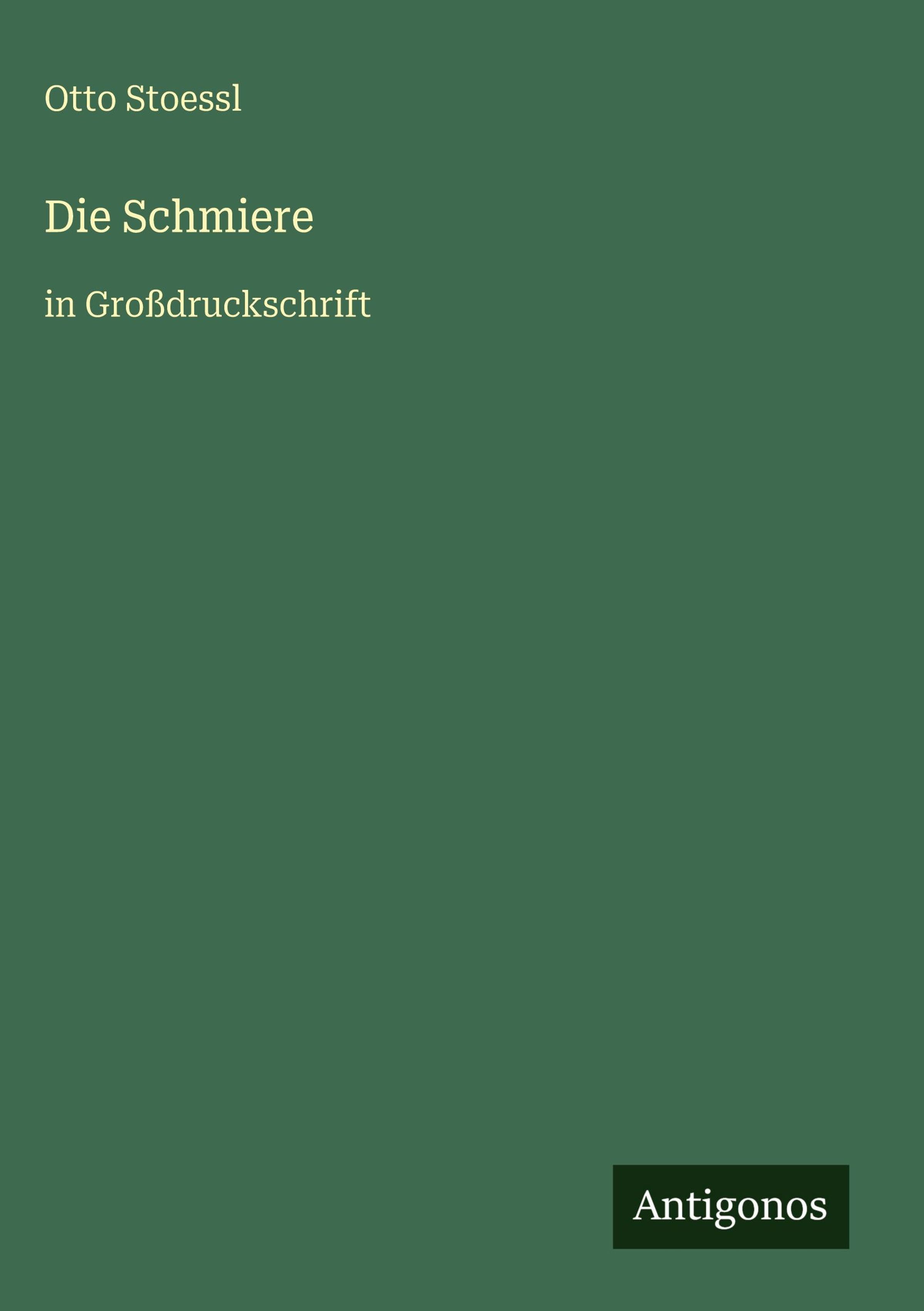 "Otto Stoessl, Die Schmiere, in Großdruckschrift" steht oben. Logo unten: "Antigonos". Dunkelgrüner Hintergrund., Buch