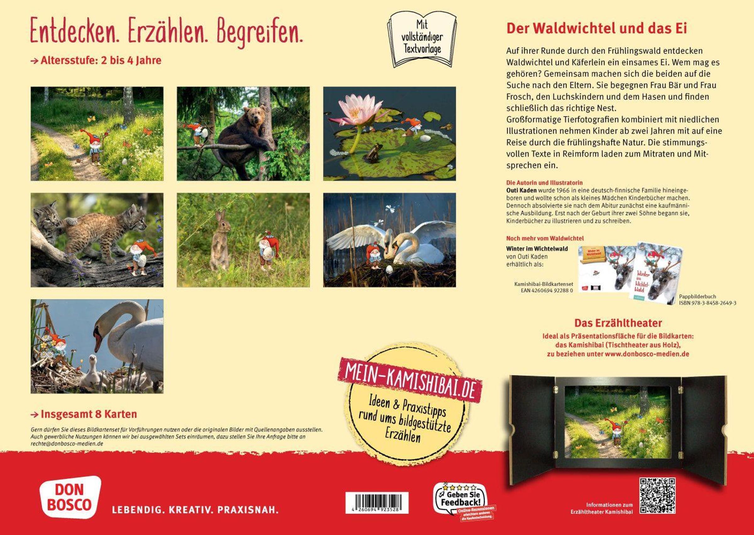 Auf der Suche nach den Eltern des gefundenen Eis besucht der kleine Waldwichtel Bär, Frosch und andere Waldtiere. Die großformatigen Kamishibai-Bildkarten machen die Wichtelgeschichte schon für kleine Kinder begreifbar. Der Vortrag und die Geschwindigkeit, mit der die Bildkarten aus dem Rahmen gezogen werden, kann an die Bedürfnisse der Zuhörer: innen angepasst werden. So gehen keine Einzelheiten der Frühlingsgeschichte in Reimen verloren.