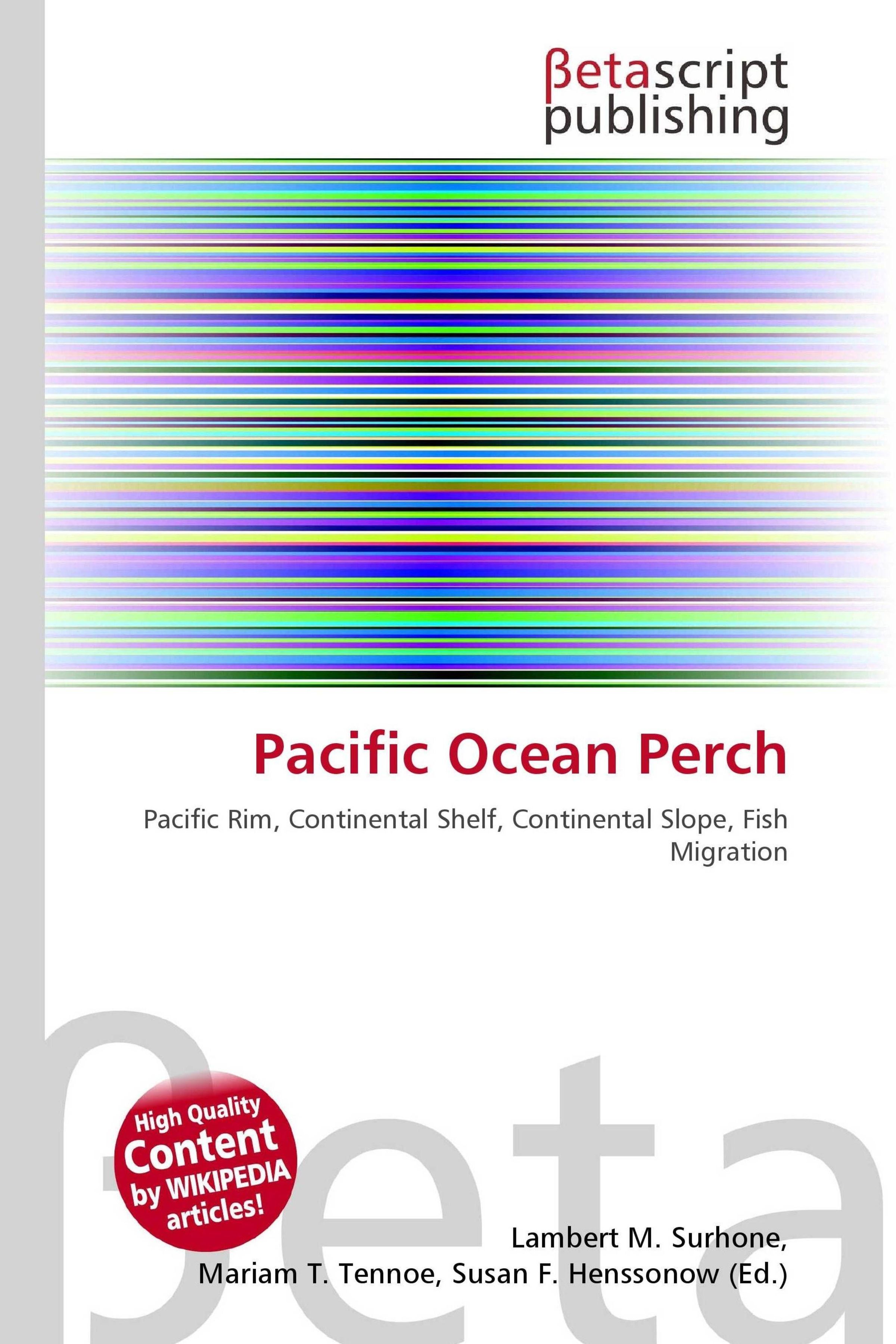 "Pacific Ocean Perch" beschreibt Fischmigration. Bunt gestreifte Illustration. Betascript Publishing oben rechts., Buch