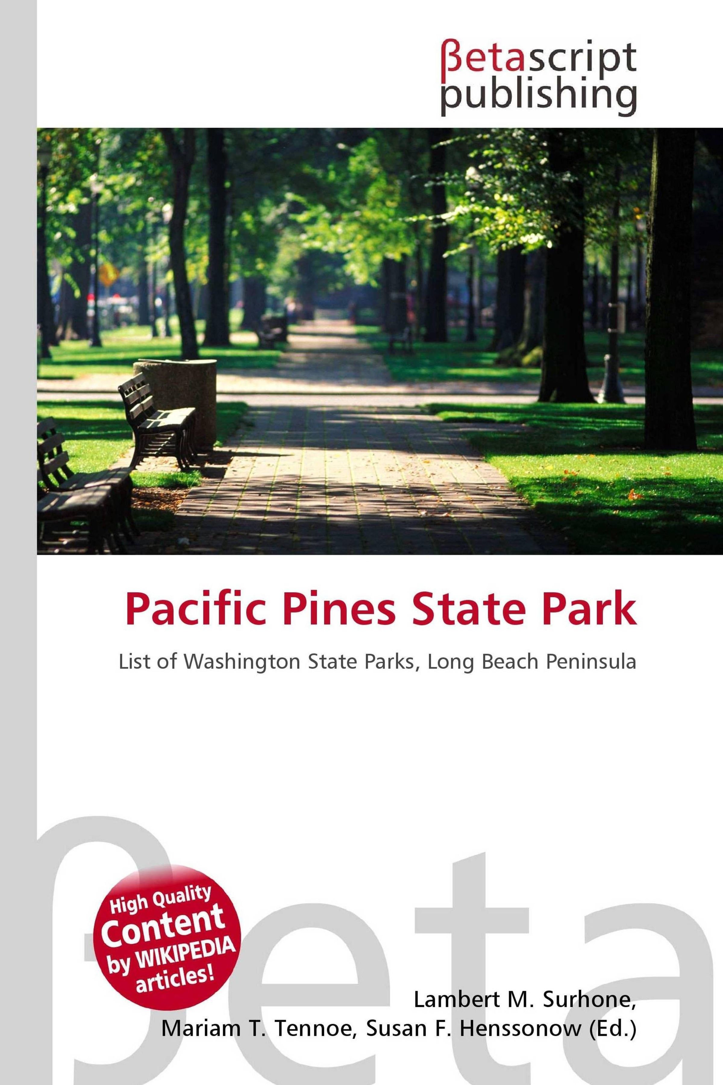 Please note that the content of this book primarily consists of articles available from Wikipedia or other free sources online. Pacific Pines State Park is a small, Washington state park, USA on the Long Beach Peninsula, just north of Ocean Park, Washington. From the main parking area, there is a narrow, sandy footpath that leads through a grove of Pacific Ponderosa pine trees to the beach. The park includes two uncovered picnic tables with grills and one restroom. This is a list of state parks and reserves in the U. S. state of Washington which are part of the Washington State Park System.