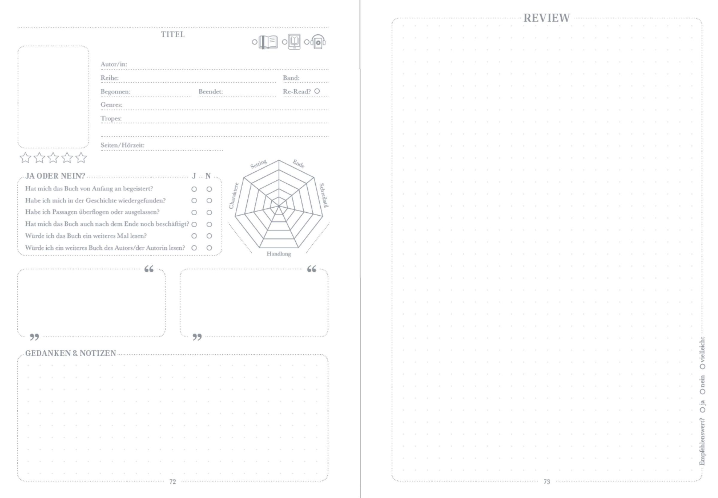 - Platz für 114 Bücher: 84 Kurzreviews (1 Doppelseite) und 30 Langreviews (2 Doppelseiten pro Buch); 2 Lesebändchen (rot und gelb), Goldschnitt, Seiten mit Statistiken, Rückblicken, Tracker, Lesebingo,