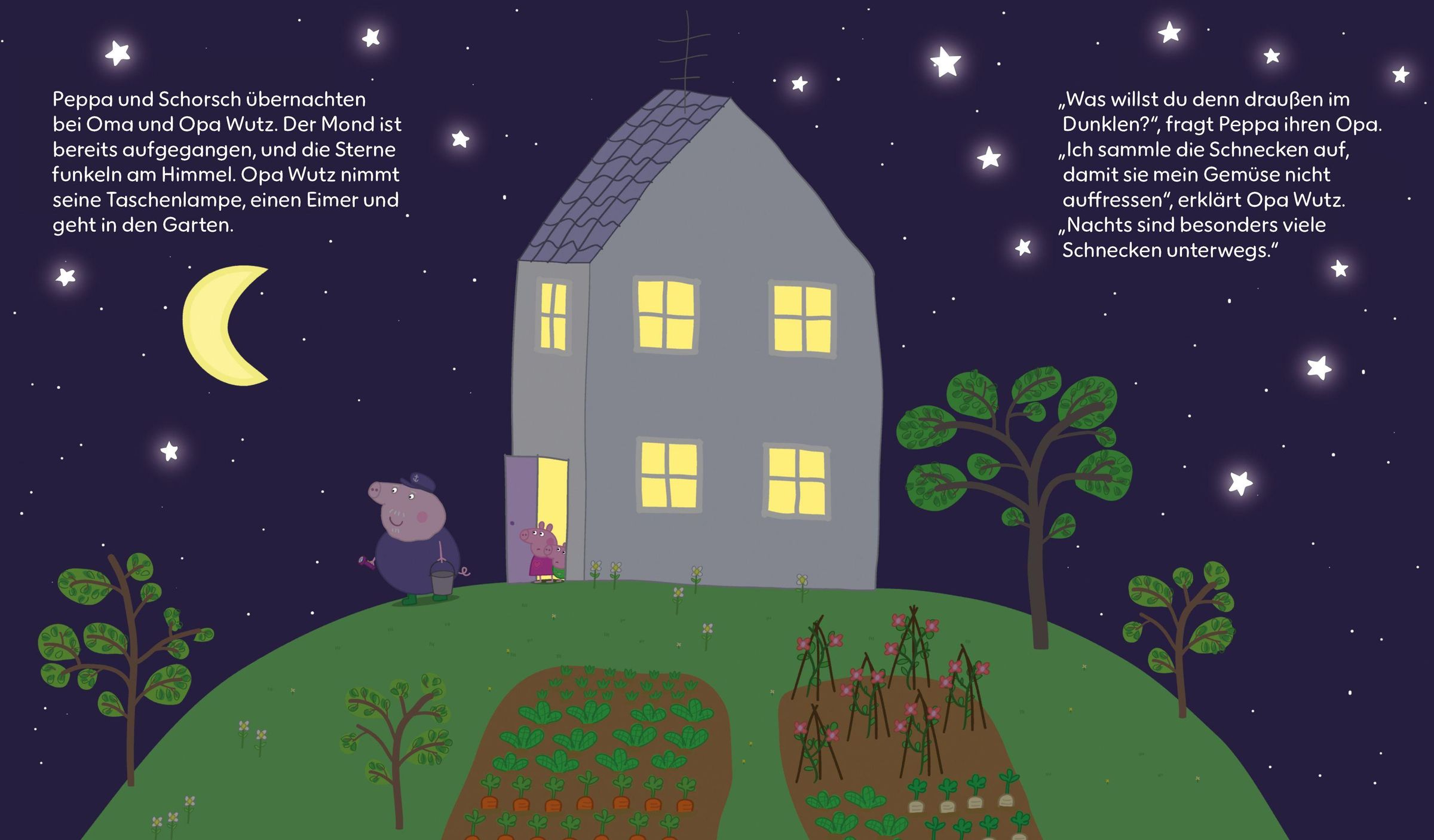 Wenn die Sterne am Himmel funkeln und der Mond aufgeht, wird es auch für kleine Schweinchen Zeit, schlafen zu gehen. Begleite Peppa und Schorsch, wenn sie vor dem Zubettgehen ihrem Opa helfen, Schnecken im Garten aufzusammeln, und dabei andere Tiere entdecken, die nachts unterwegs sind. Halte jede Seite für 30 Sekunden unters Licht und bringe so Opa Wutz' Taschenlampe, Nachttiere und vieles mehr zum Leuchten! Eine wunderschöne Gutenachtgeschichte mit Glow-in-the-Dark-Effekt auf jeder Seite!