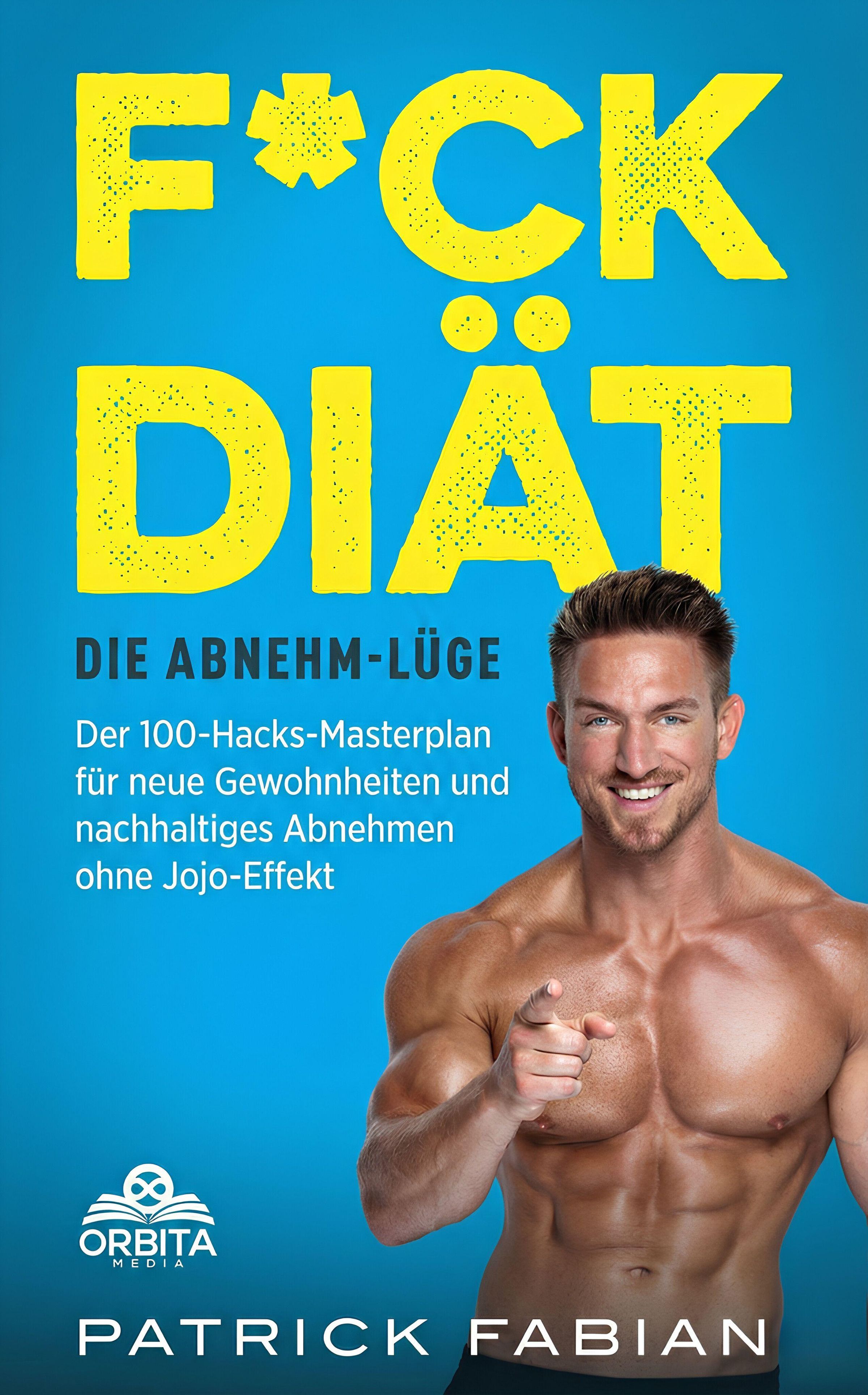 Text: "F*CK DIÄT. DIE ABNEHM-LÜGE. Der 100-Hacks-Masterplan für neue Gewohnheiten und nachhaltiges Abnehmen ohne Jojo-Effekt. ORBITA MEDIA. PATRICK FABIAN." Ein lächelnder, muskulöser Mann zeigt nach vorne., Buch