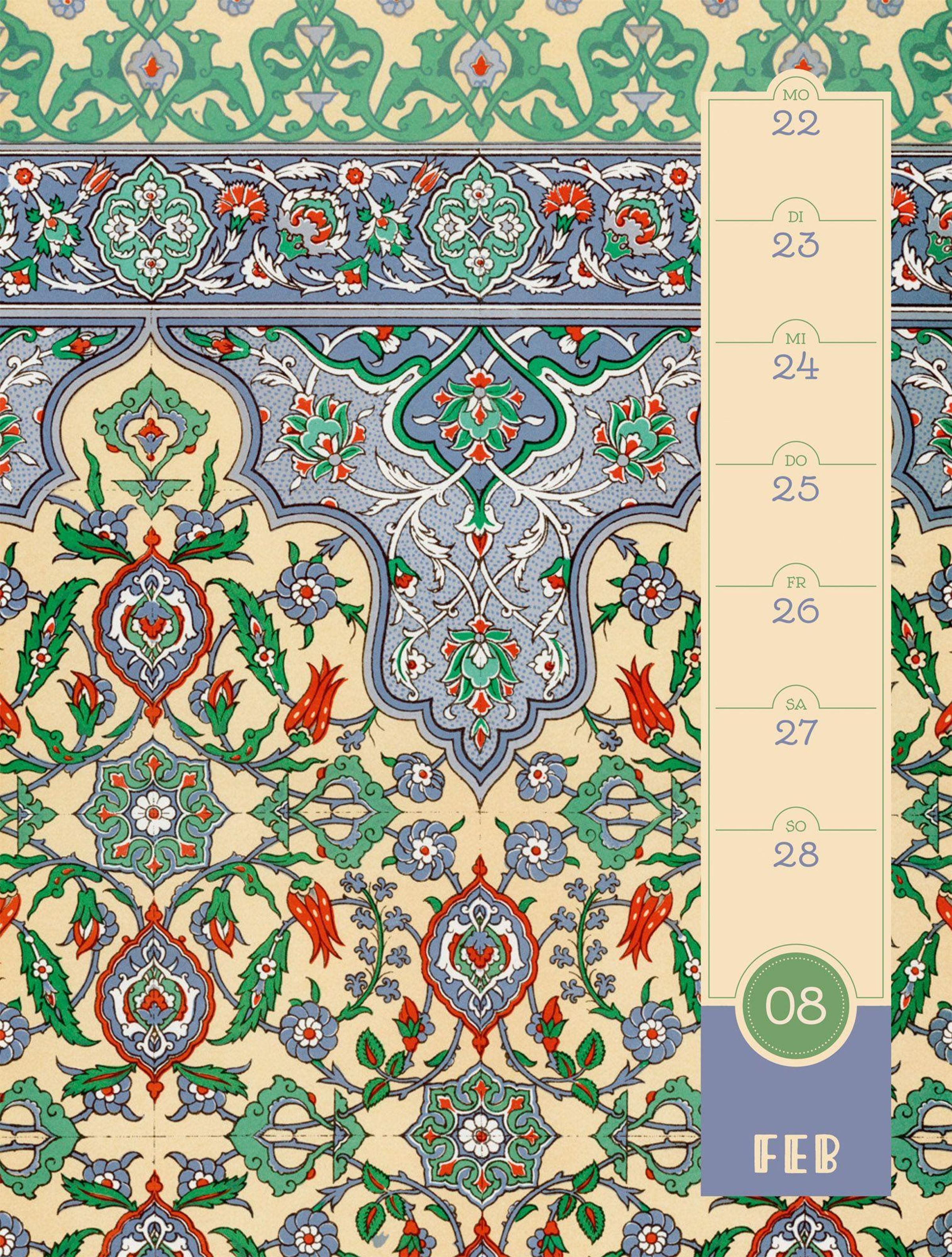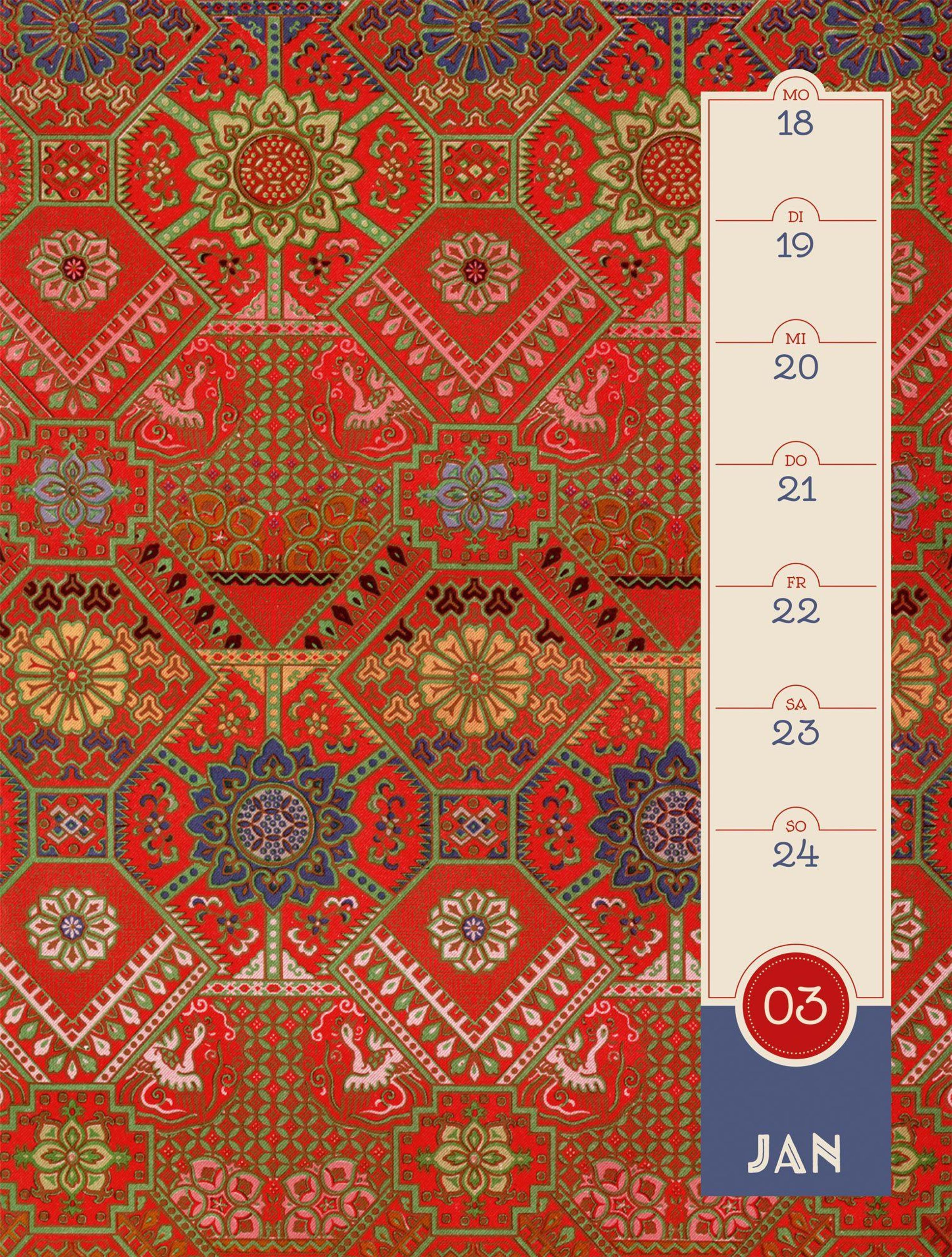Der Wochenplaner "Patterns" ist eine Hommage an die Kunst des Dekors und die Schönheit ornamentaler Gestaltung im Stile William Morris'. Auf jedem Kalenderblatt entfalten sich detailreiche Muster, die an die Pracht vergangener Epochen erinnern - florale Kompositionen, kunstvolle Linien, geometrische Formen und filigrane Verzierungen. Die Motive zeigen, wie meisterhaft Farbe, Form und Rhythmus zu kunstvollen Wand- und Fensterbildern verwebt werden. Ein Kalender für Designliebhaber: innen, Ästhet: innen und alle, die Freude an farbenfrohen und nostalgischen Mustern haben. Perfekt auch für Scrapbook-Fans auf der Suche nach Inspiration und Material. Übersichtliches Kalendarium und jede Woche neuer Rätselspaß: Kreuzworträtsel und Sudokus auf allen Rückseiten.