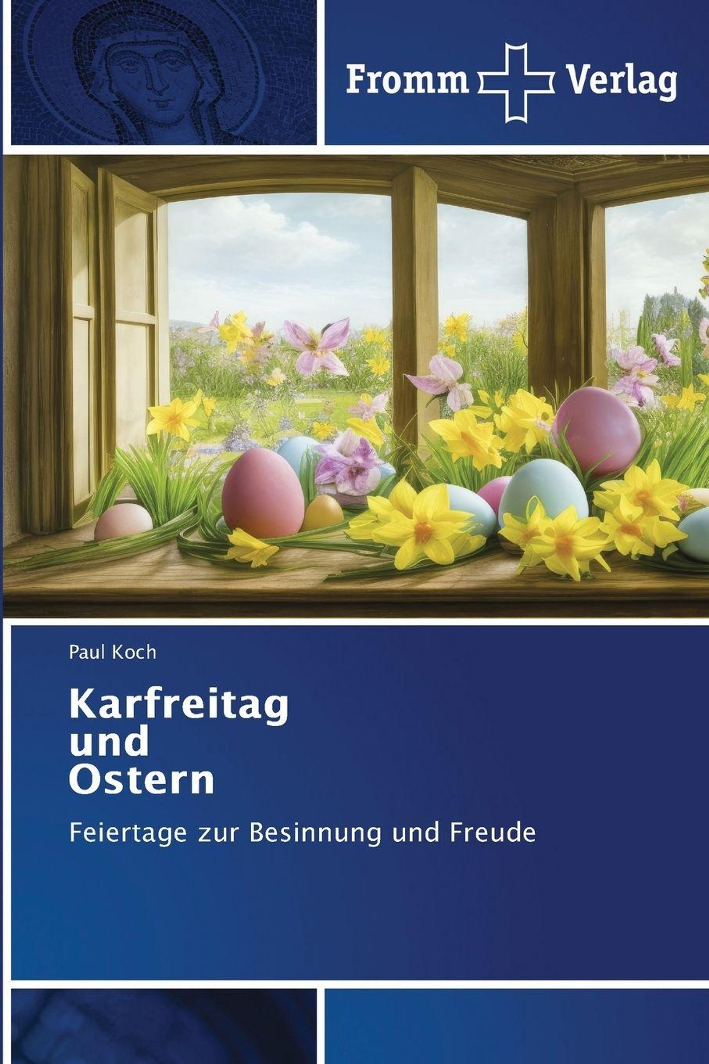 Buchtitel: "Karfreitag und Ostern" von Paul Koch. Ein Fenster mit Frühlingslandschaft, Ostereiern und Narzissen., Buch