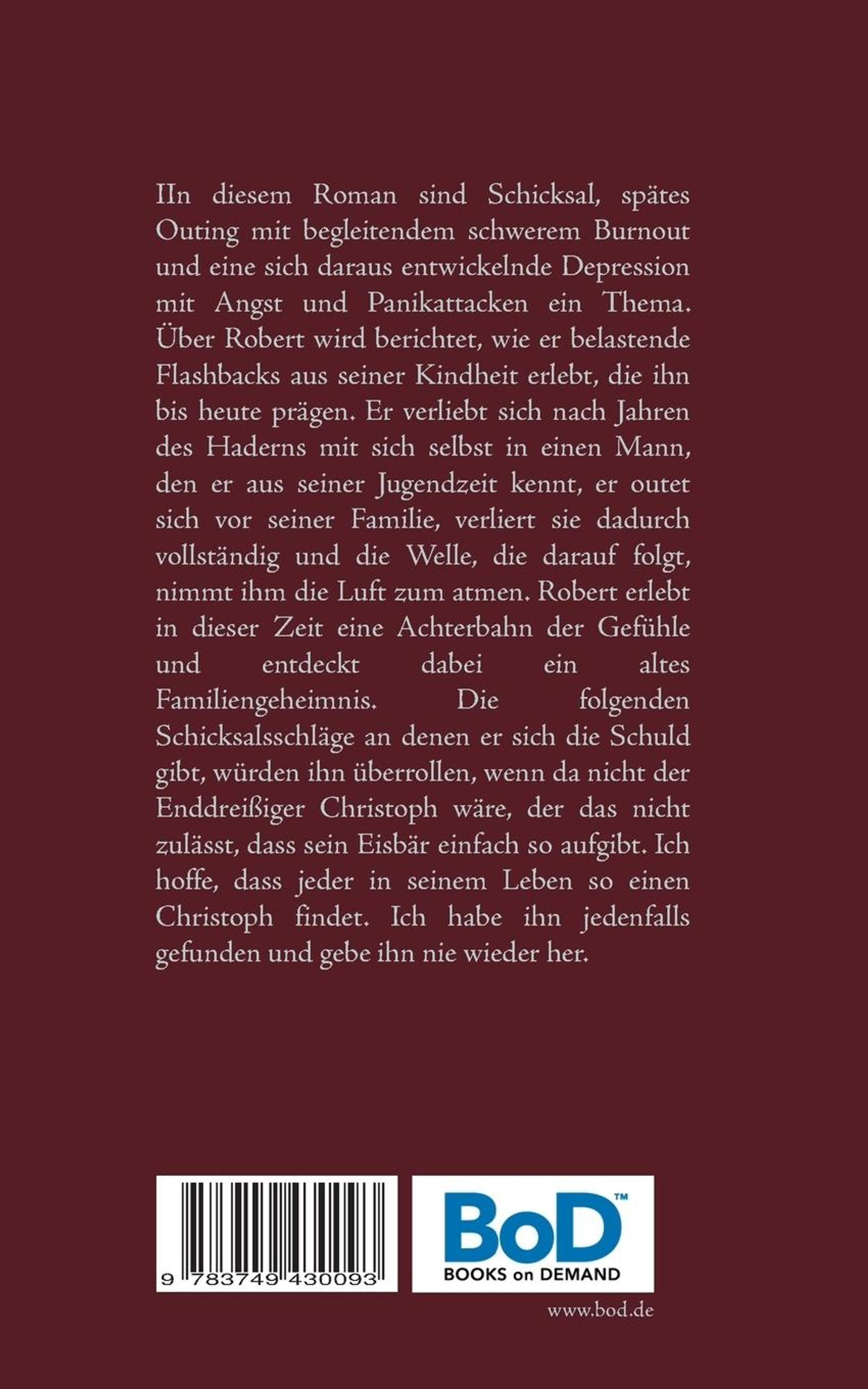 In diesem Roman sind Schicksal, spätes Outing mit begleitendem schwerem Burnout und eine sich daraus entwickelnde Depression mit Angst und Panikattacken ein Thema. Über Robert wird berichtet, wie er belastende Flashbacks aus seiner Kindheit erlebt, die ihn bis heute prägen. Er verliebt sich nach Jahren des Haderns mit sich selbst in einen Mann, den er aus seiner Jugendzeit kennt, er outet sich vor seiner Familie, verliert sie dadurch vollständig und die Welle, die darauf folgt, nimmt ihm die Luft zum Atmen. Robert erlebt in dieser Zeit eine Achterbahn der Gefühle und entdeckt dabei ein altes Familiengeheimnis. Die folgenden Schicksalsschläge an denen er sich die Schuld gibt, würden ihn überrollen, wenn da nicht der Enddreißiger Christoph wäre, der das nicht zulässt, dass sein Eisbär einfach so aufgibt. Ich hoffe, dass jeder in seinem Leben so einen Christoph findet. Ich habe ihn jedenfalls gefunden und gebe ihn nie wieder her.
