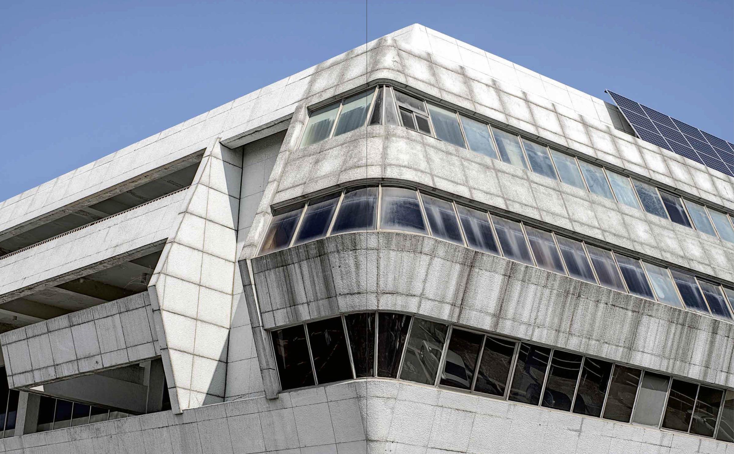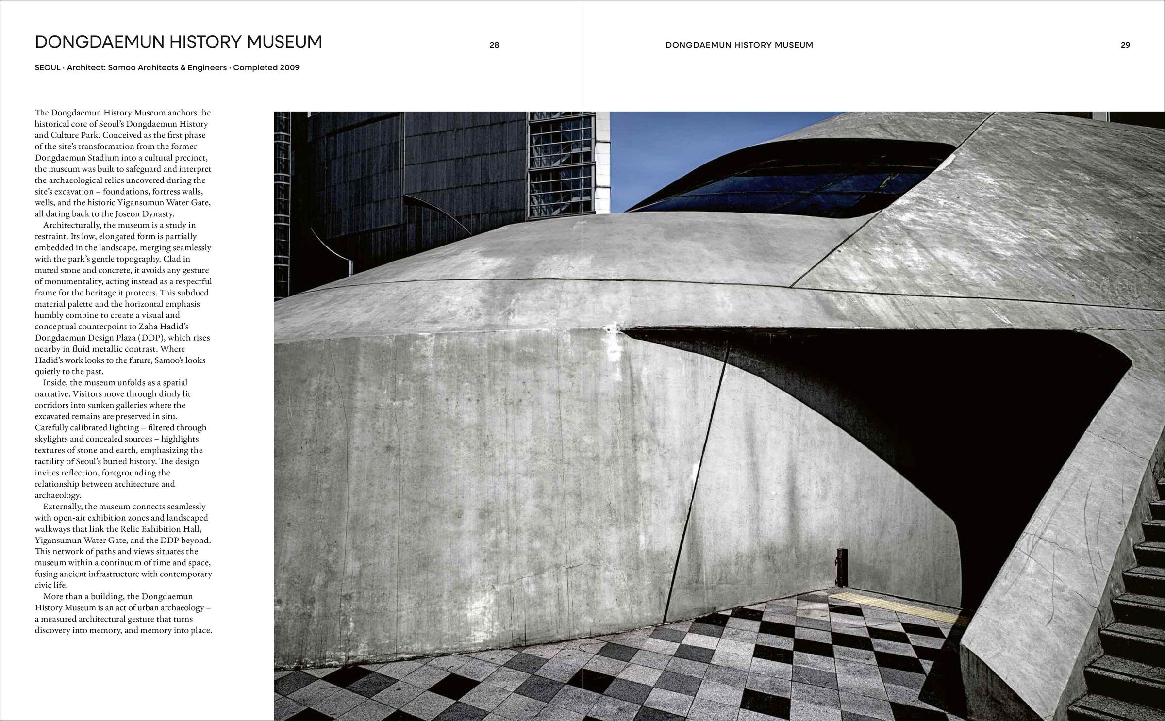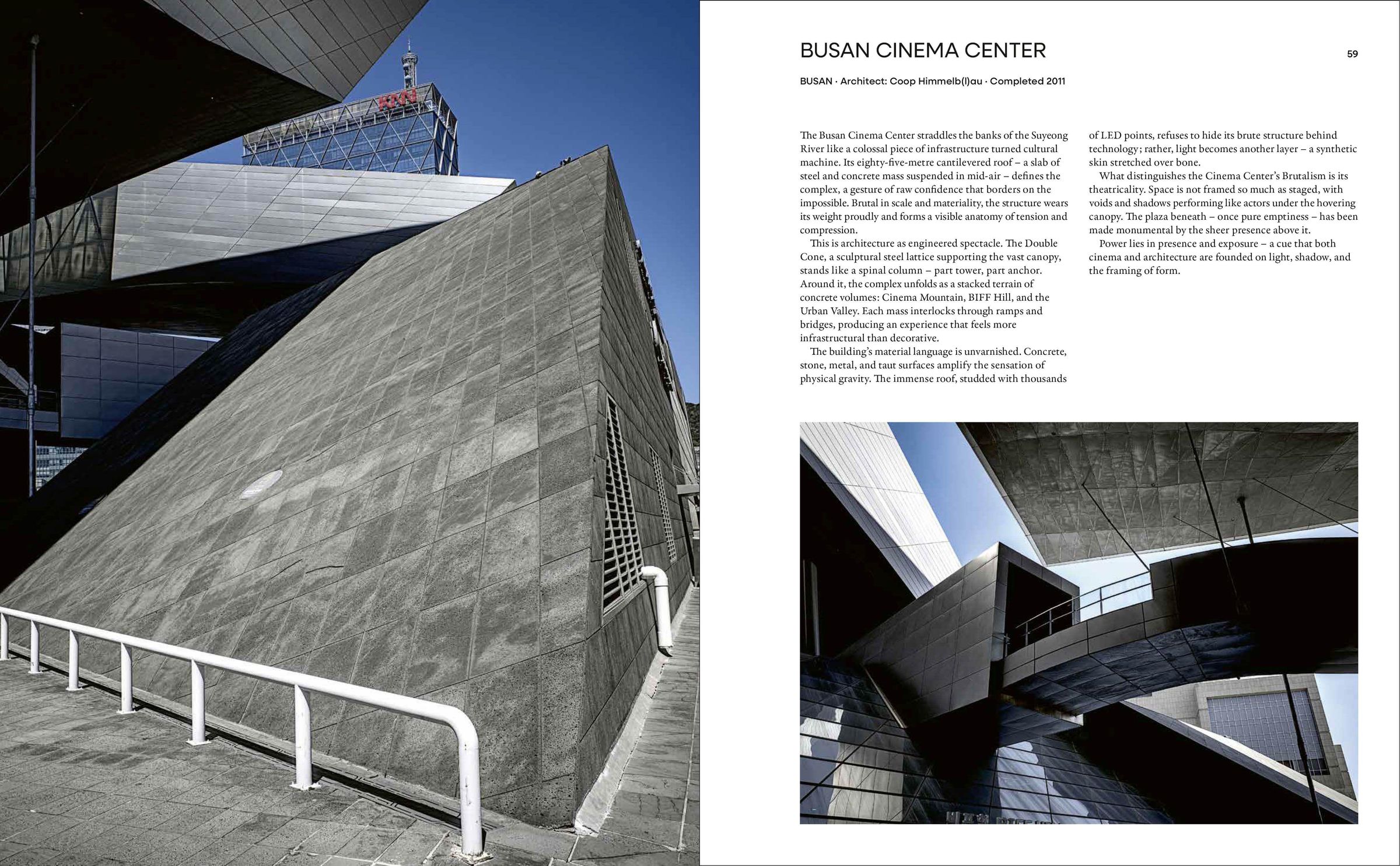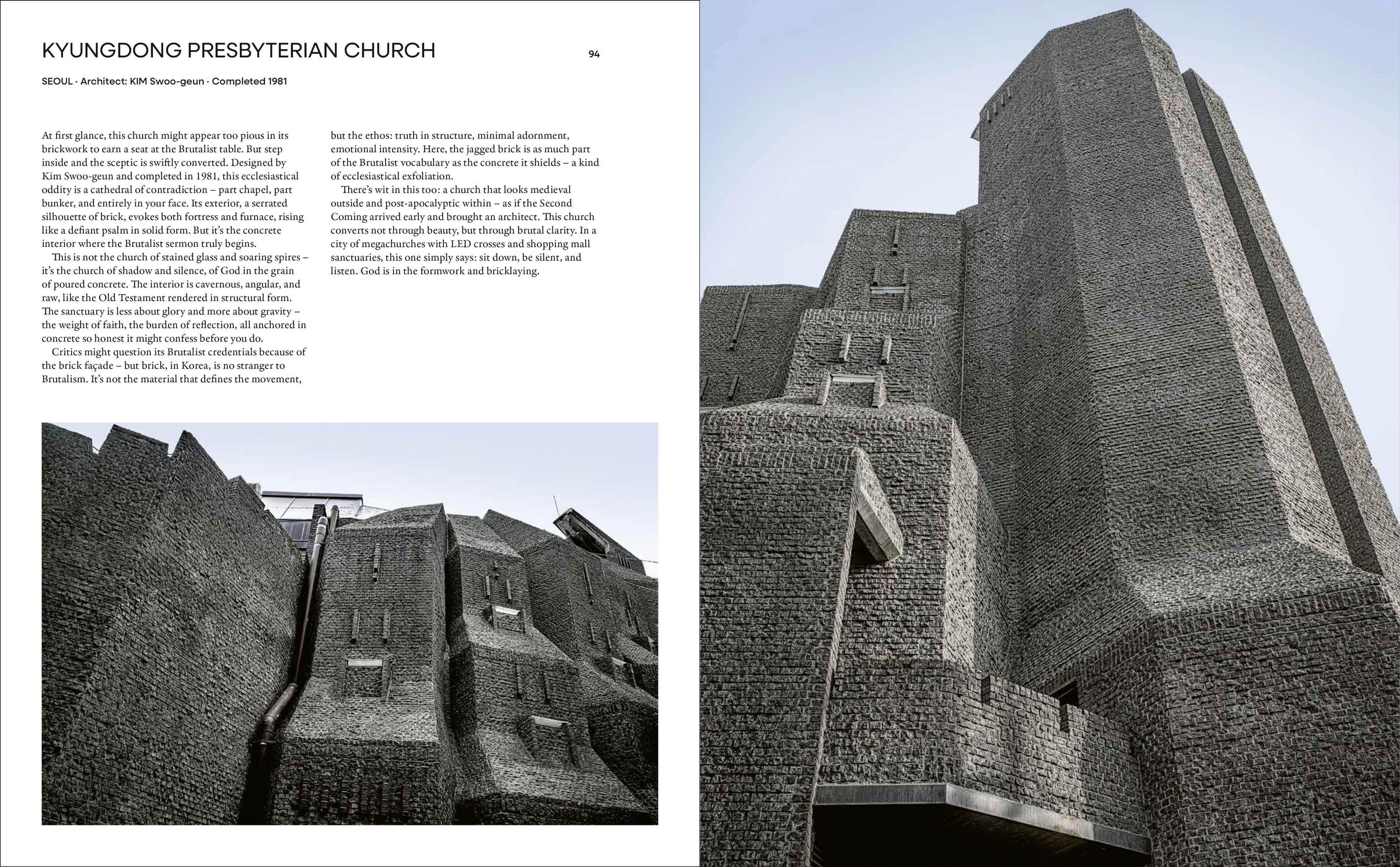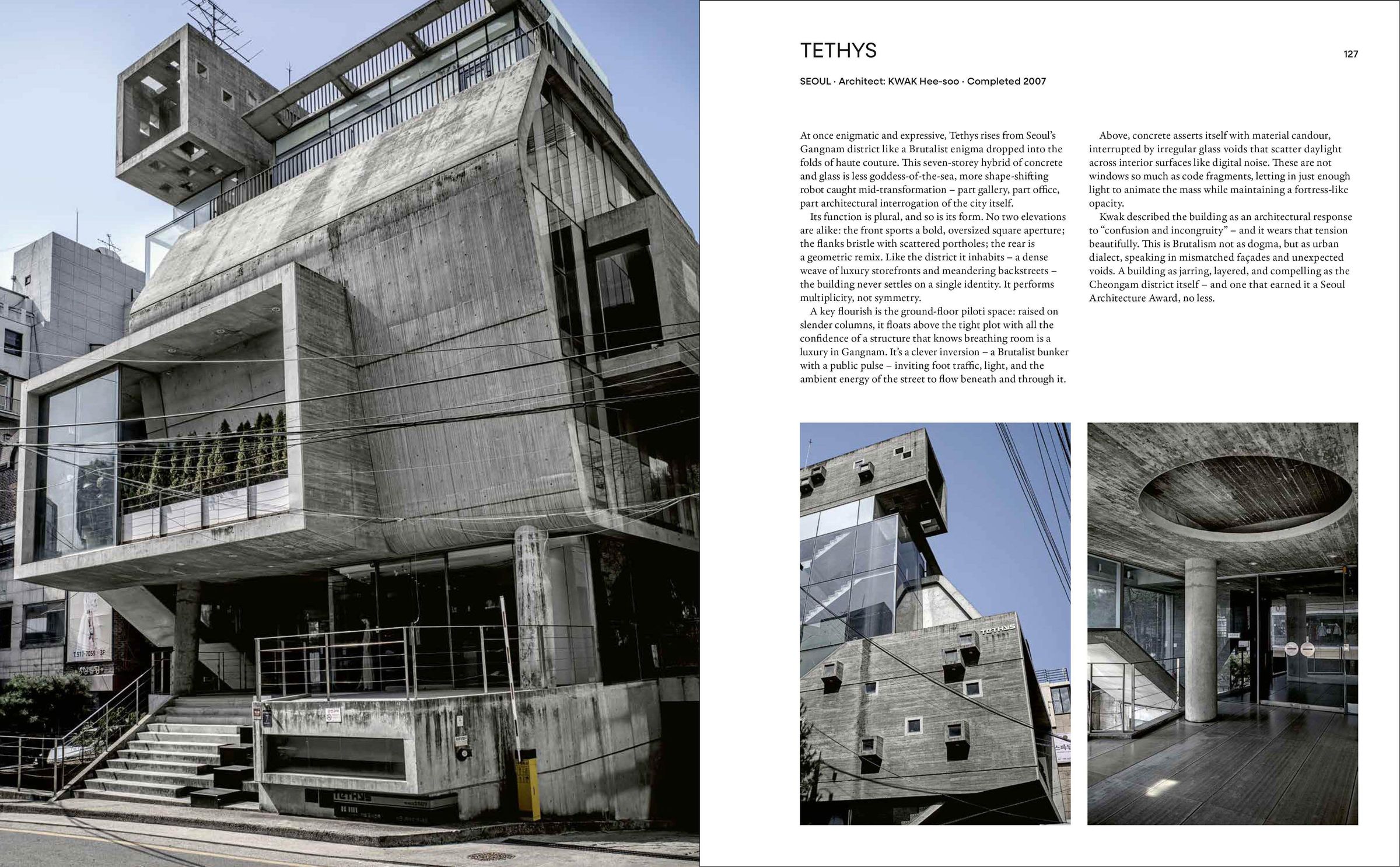 "BRUTALIST KOREA" und "Paul Tulett". Betongebäude mit diagonalen Linien und Schatten. Logo rechts unten., Buch